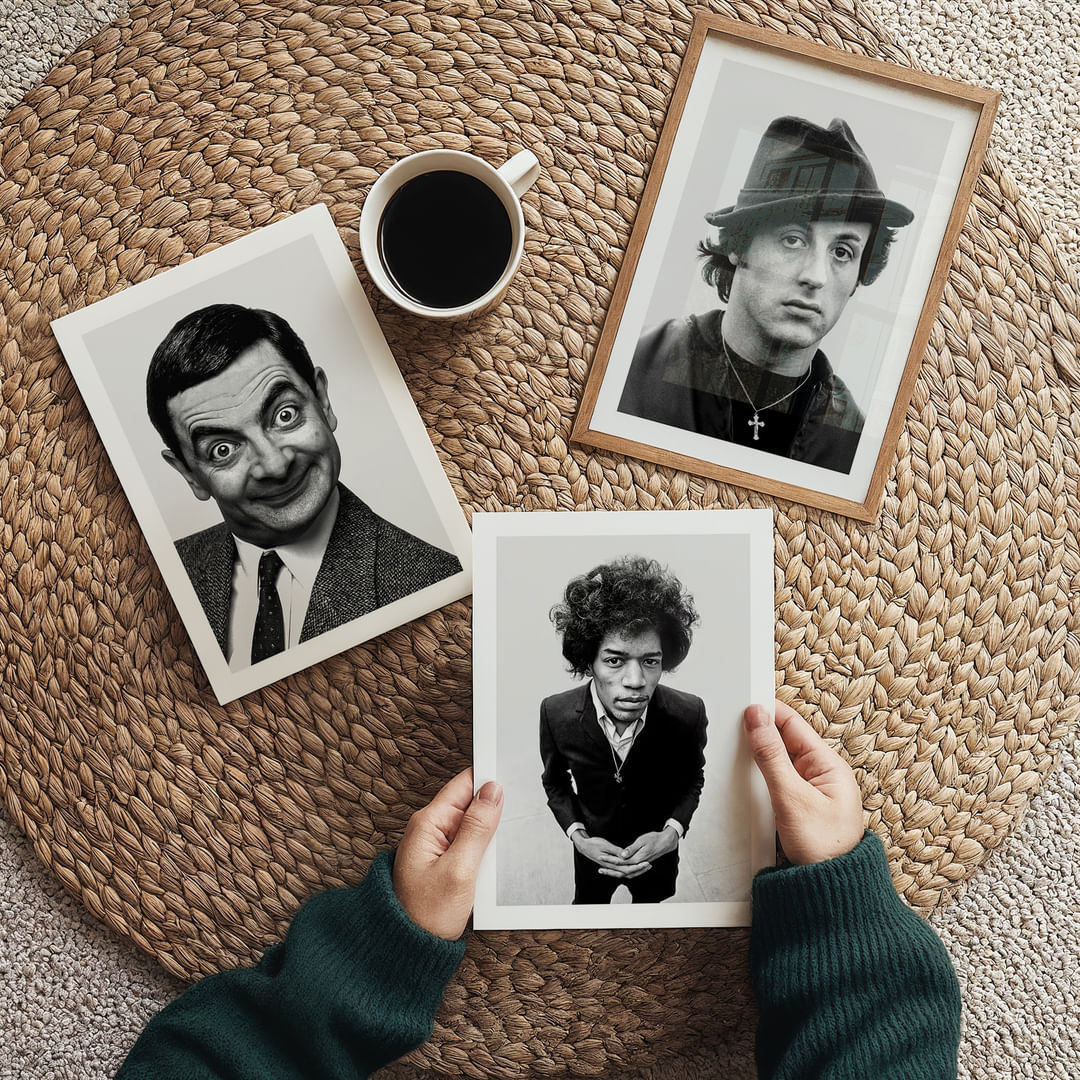 Estes cartazes reúnem uma poderosa mistura de retratos a preto e branco que captam a essência de personalidades icónicas como Rowan Atkinson como Mr. Bean, Sylvester Stallone como Rocky Balboa e Jimi Hendrix. As expressões lúdicas e os olhares intensos harmonizam-se na perfeição e criam um contraste interessante com o preto e o branco. Uma viagem visual através do tempo e da cultura que realça a atmosfera de qualquer ambiente com um toque de história e aura.