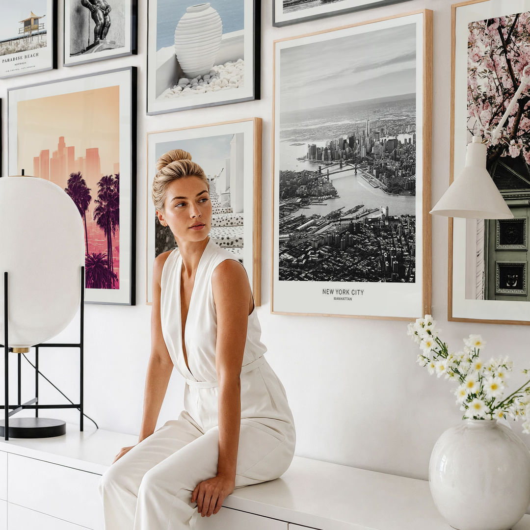 Esta arte de parede combina a elegância dos motivos urbanos com a tranquilidade da natureza, oferecendo uma mistura fascinante de pósteres coloridos e a preto e branco. A sua interação harmoniosa de elementos urbanos e orgânicos evoca uma sensação de equilíbrio e tranquilidade. Perfeita para dar a um ambiente uma atmosfera moderna e sofisticada, eleva realmente qualquer design de interiores a um novo patamar.