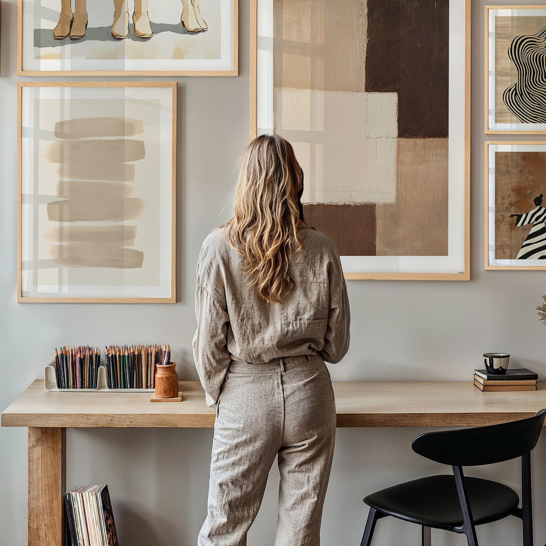 Uma parede de arte de bom gosto onde tons e texturas terra se entrelaçam para criar uma sensação de calma e sofisticação. A interação harmoniosa dos cartazes oferece um equilíbrio perfeito entre formas abstratas e elegantes, o que realça a atmosfera do ambiente. Esta coleção harmoniosa proporciona uma dimensão artística que eleva qualquer sala de estar com a sua expressão subtil, mas poderosa.