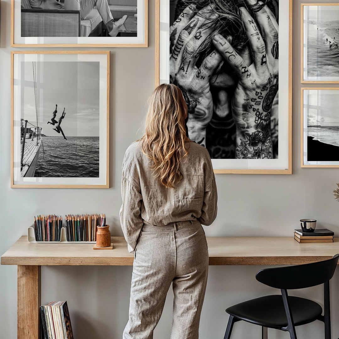 Esta parede de arte capta a atenção do observador com poderosos pósteres a preto e branco que, em conjunto, criam uma atmosfera dramática e instigante. Os motivos livres e os contrastes profundos transmitem uma sensação de mistério e introspeção. A harmonia entre as cenas marítimas e os retratos pessoais contribui para uma expressão elegante que aprofunda o carácter e o estilo do ambiente.