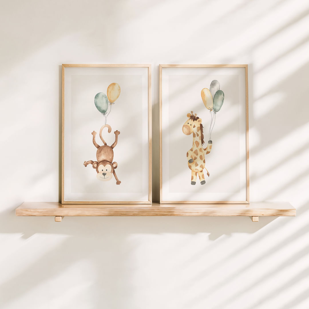 Tons pastel suaves e motivos lúdicos criam uma parede encantadora de pinturas onde um macaco e uma girafa flutuam em balões. Esta combinação de humor e leveza espalha alegria e energia despreocupada. As pinturas dão vida ao ambiente através do posicionamento equilibrado e da luz natural, criando um equilíbrio perfeito entre diversão e estilo.
