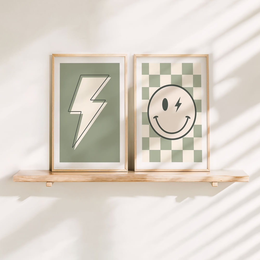 Esta parede de arte emana uma energia lúdica e um charme eletrizante através das suas pinturas harmoniosas. A pintura da esquerda com o símbolo do relâmpago contrasta elegantemente com o rosto feliz da pintura da direita, criando uma dinâmica vibrante e equilibrada. A paleta de cores verde e bege contribui para uma atmosfera suave, mas expressiva, que realça a estética do ambiente e cria um conjunto agradável.