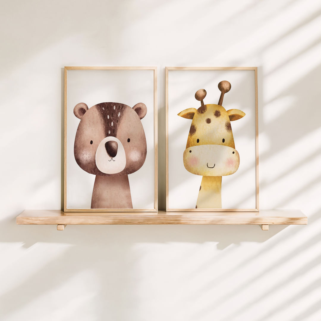 A parede de quadros brilha com os seus tons suaves e quentes, e os motivos animais retratados de forma lúdica conferem ao ambiente uma sensação de alegria e encanto. A combinação harmoniosa de cores terra e as ilustrações fofas de um urso e de uma girafa transmitem uma sensação de segurança e descontração, criando uma atmosfera convidativa e inspiradora que ilumina o coração da casa.
