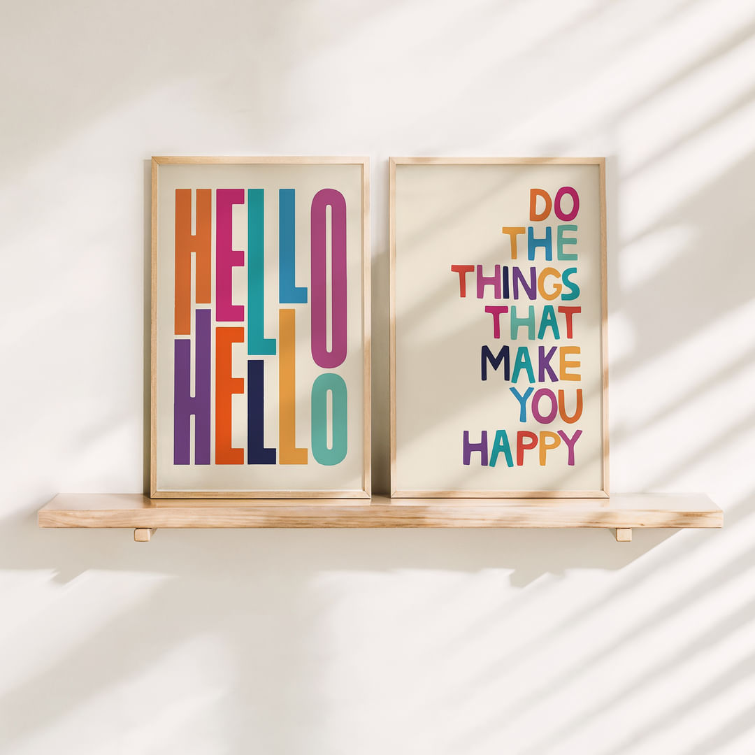 A arte de parede exala uma cascata de cores através das suas vibrantes combinações de palavras que cativam o olhar e a mente. Equilibra a energia do ambiente e cria uma atmosfera acolhedora. As letras coloridas nestes cartazes conferem à casa uma sensação de motivação lúdica e inspiração criativa. Um lembrete perfeito para se rodear de positividade e alegria que enriquecerão qualquer ambiente.