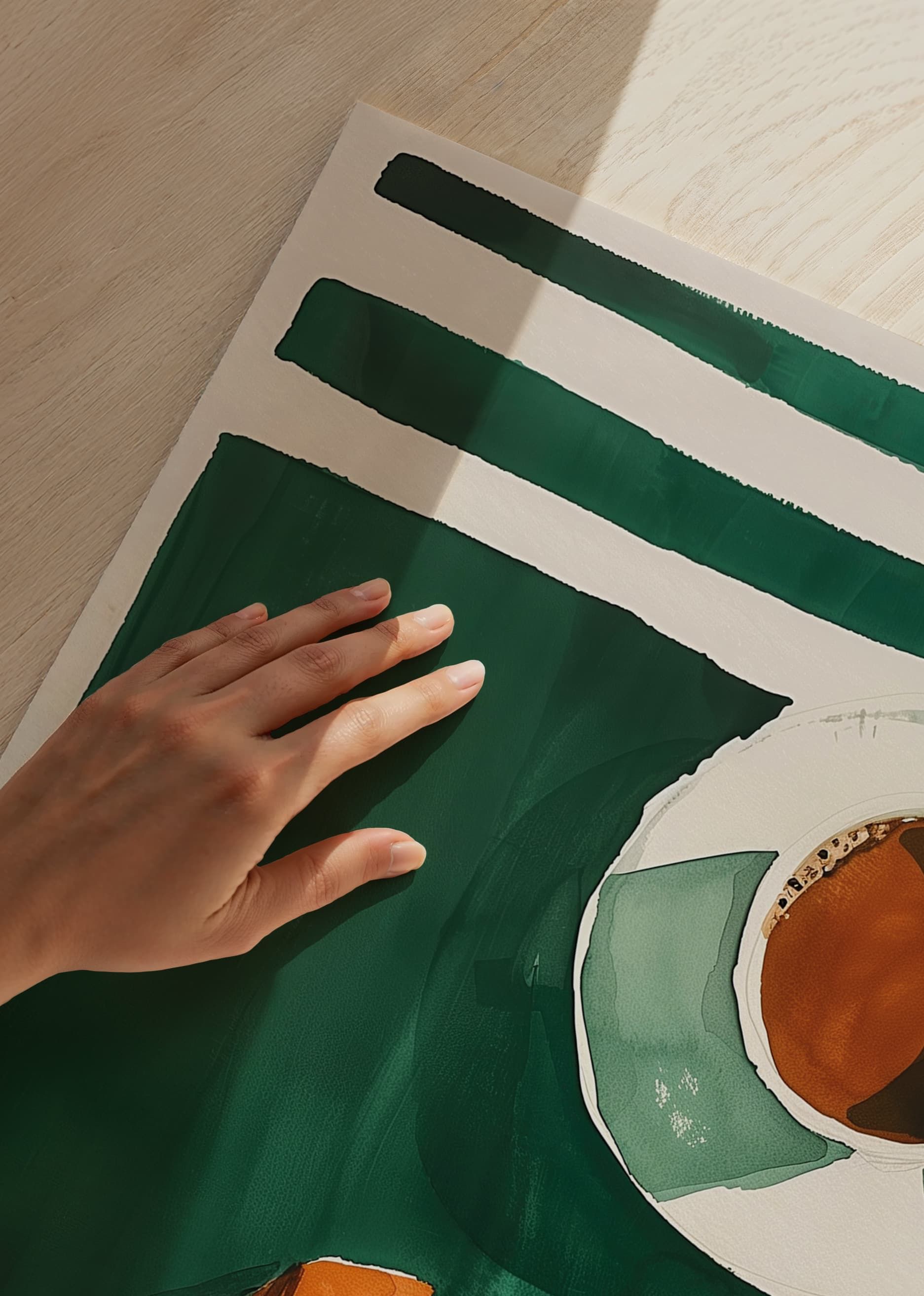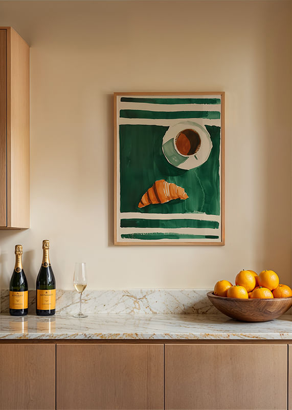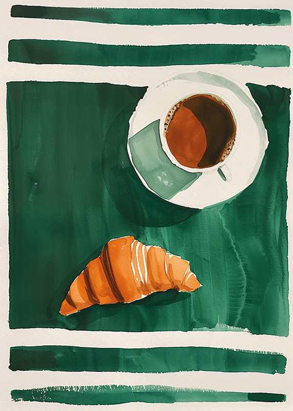Este póster capta uma manhã tranquila com uma chávena de café e um croissant dourado sobre um fundo verde escuro. O estilo minimalista e as cores contrastantes criam uma sensação de simplicidade sofisticada, perfeita para realçar o ambiente da sua cozinha ou sala de estar.