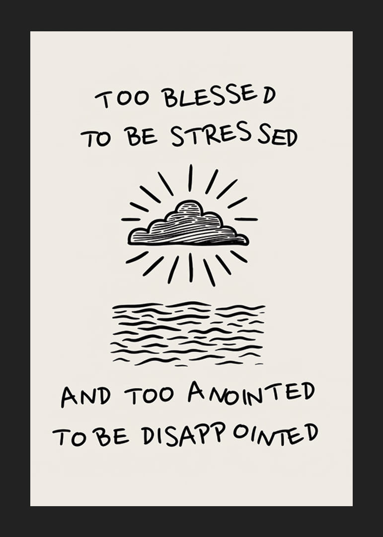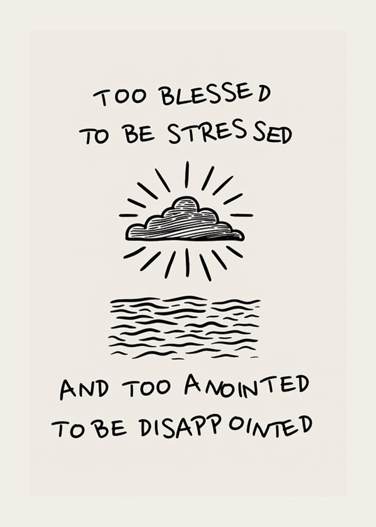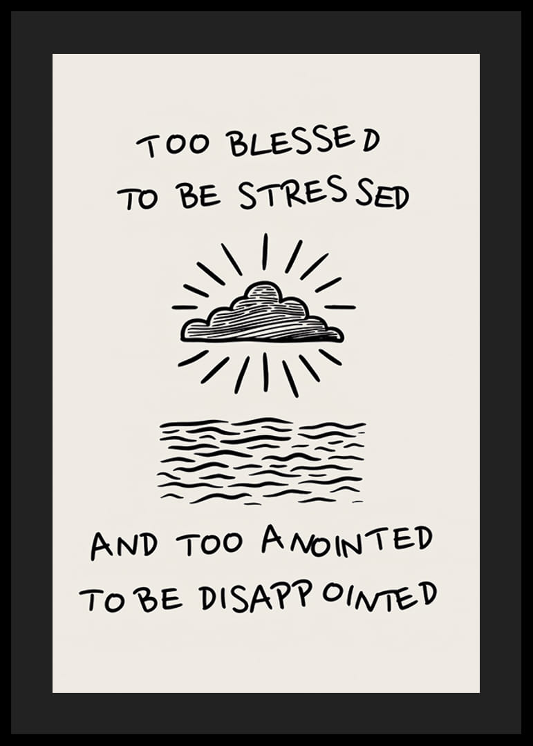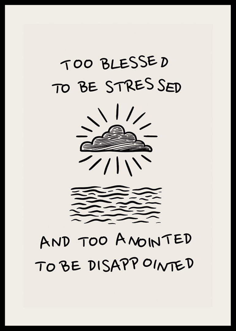 Este póster inspirador capta a essência da calma e da esperança com uma ilustração elegante de nuvens e ondas do oceano. A letra "Too blessed to be stressed" traz um poderoso lembrete para se focar no lado positivo da vida.