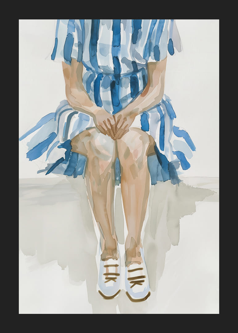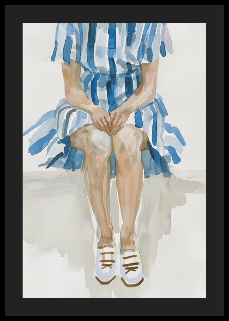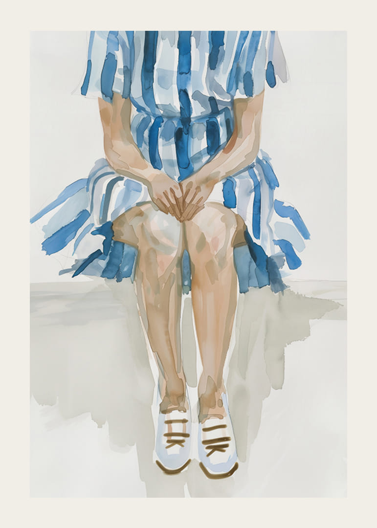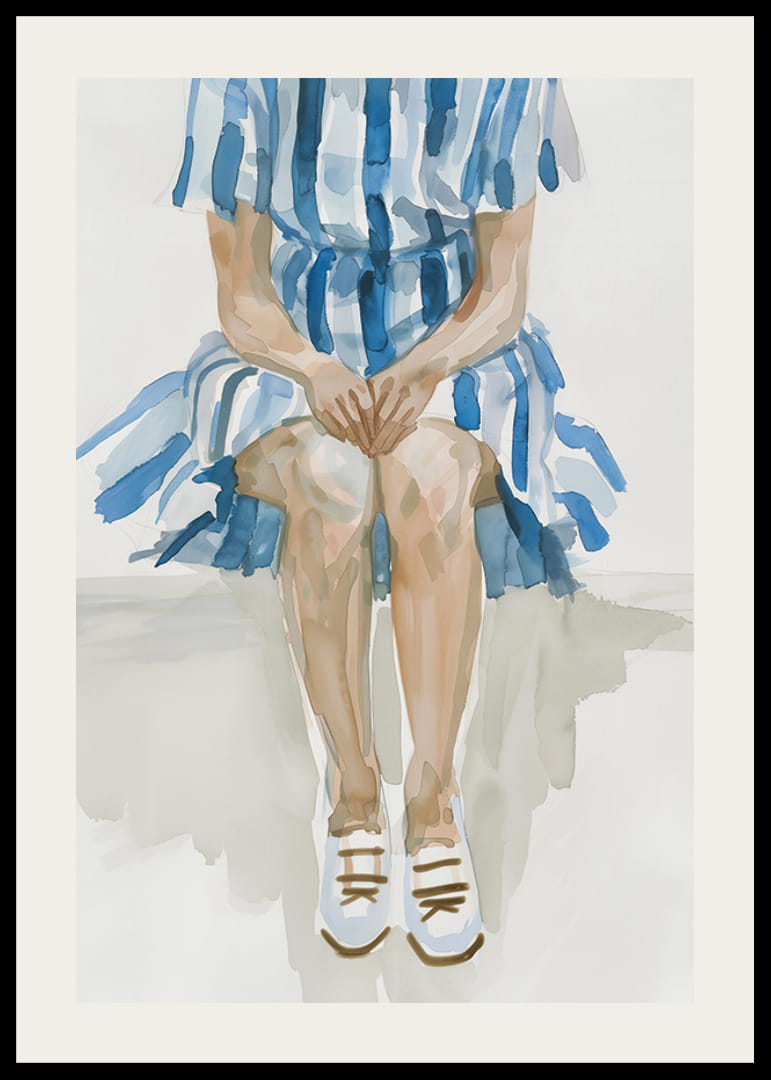 Com uma combinação harmoniosa de tons de azul e branco, este póster capta uma tranquilidade meditativa. A figura, sentada numa pose simples, mas expressiva, emana uma sensação de calma e reflexão.