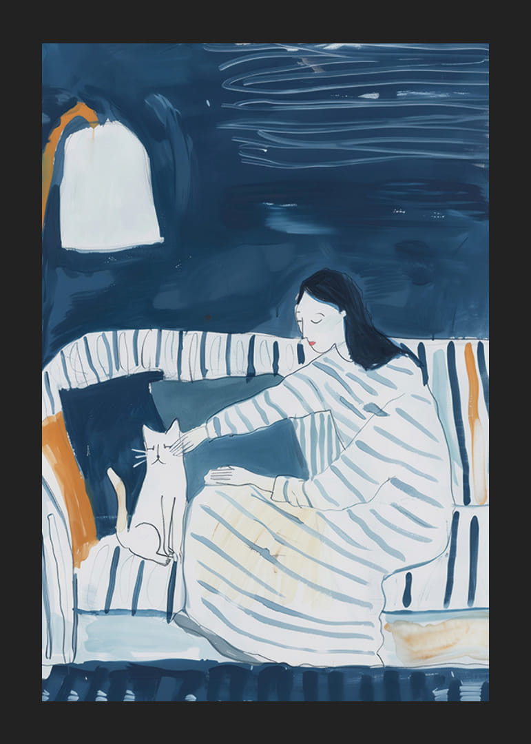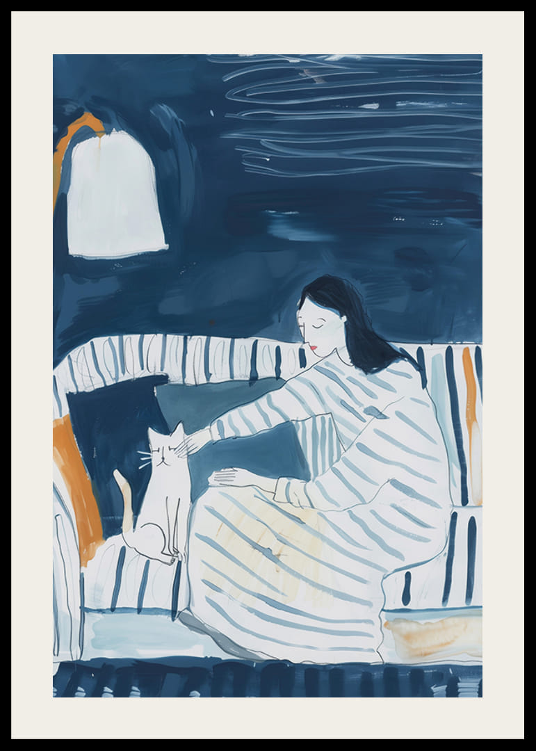 Este poster capta uma cena pacífica onde uma mulher vestida com roupas às riscas está a acariciar o seu gato num sofá confortável. Os tons suaves de azul e a luz quente do candeeiro criam uma sensação convidativa de paz e tranquilidade.