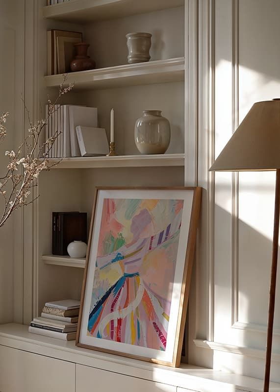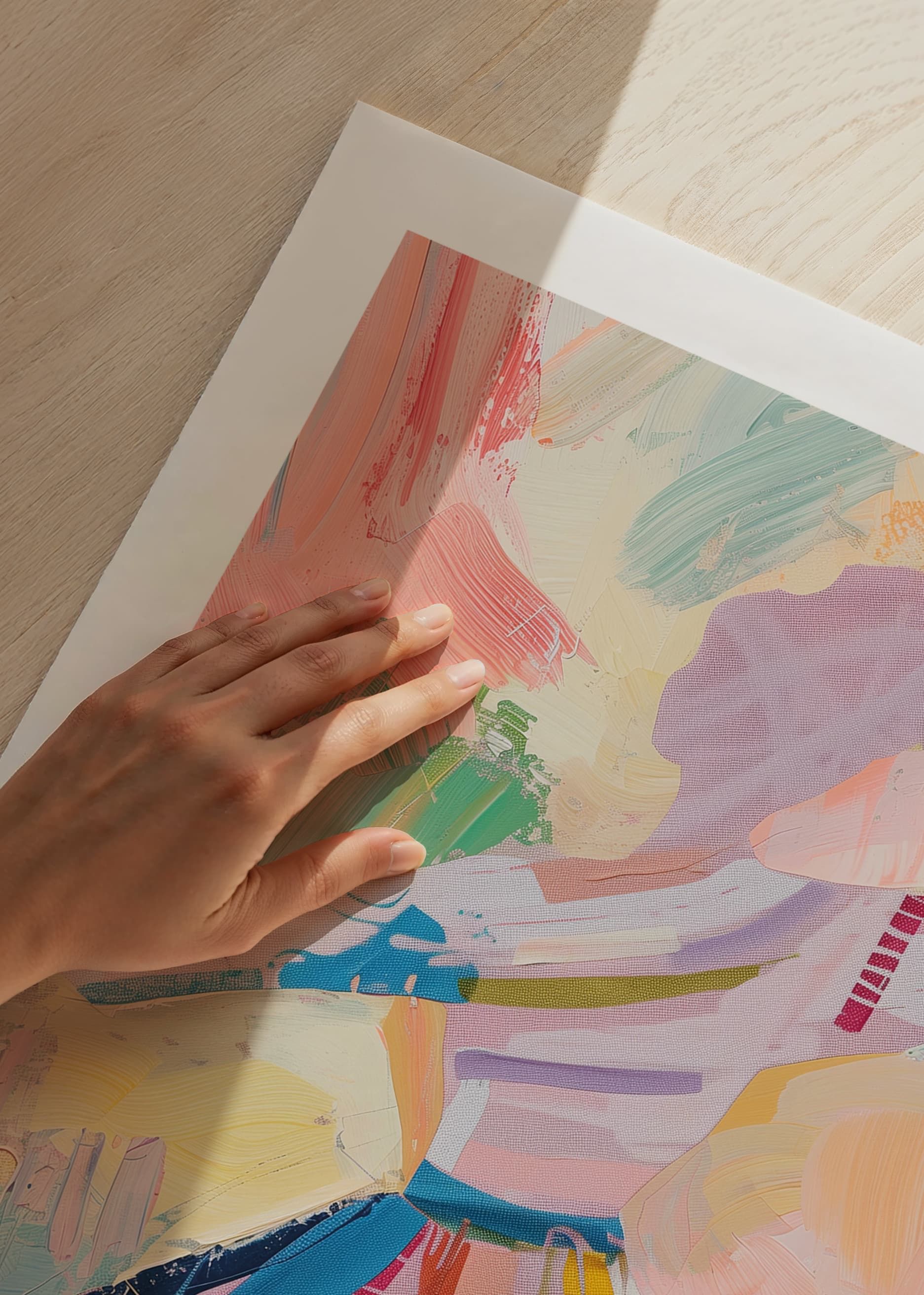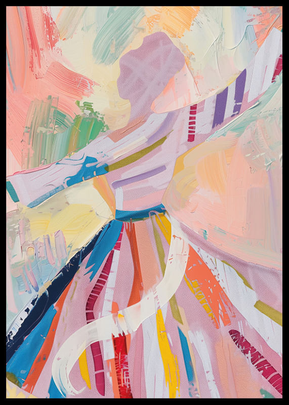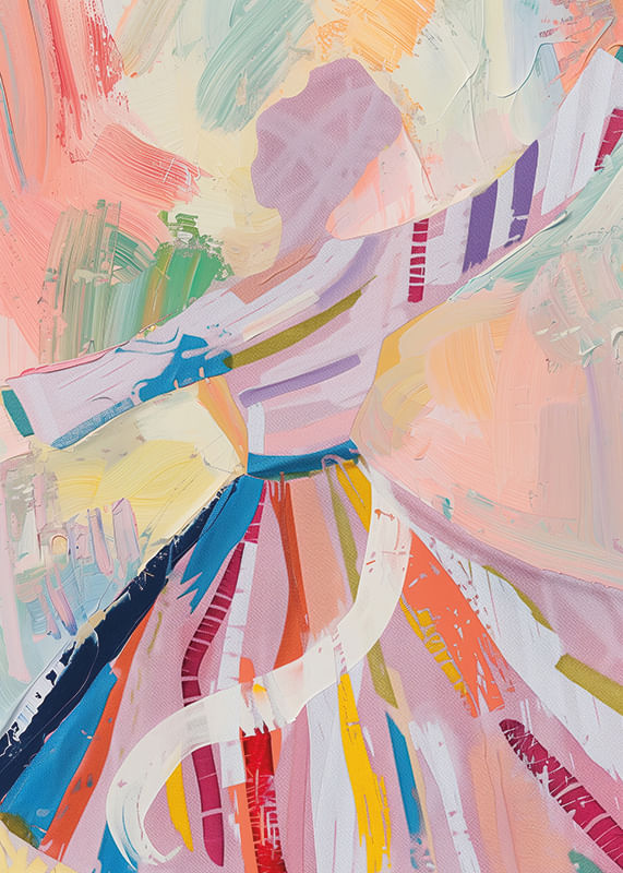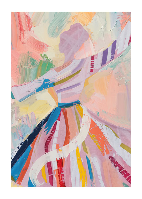 Com uma explosão de tons pastel suaves e pinceladas amplas, este póster capta a essência da dança e do movimento. A figura etérea parece flutuar num turbilhão de cores que cria uma atmosfera onírica.