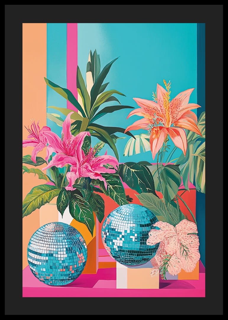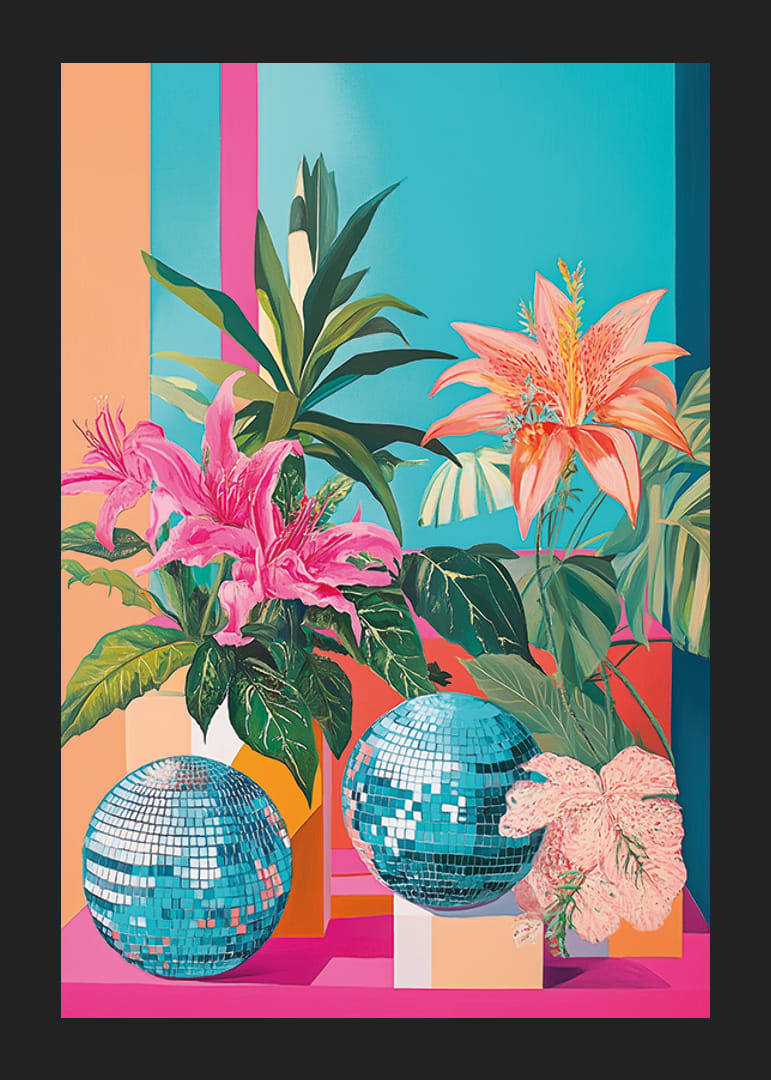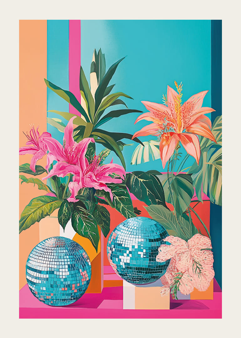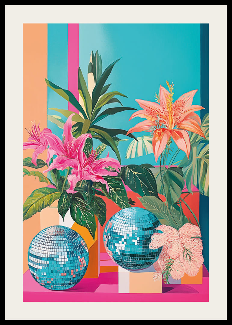 Este póster é uma mistura vibrante de flores tropicais e bolas de discoteca brilhantes sobre um fundo colorido. As cores intensas criam uma atmosfera alegre e energética que anima qualquer ambiente.