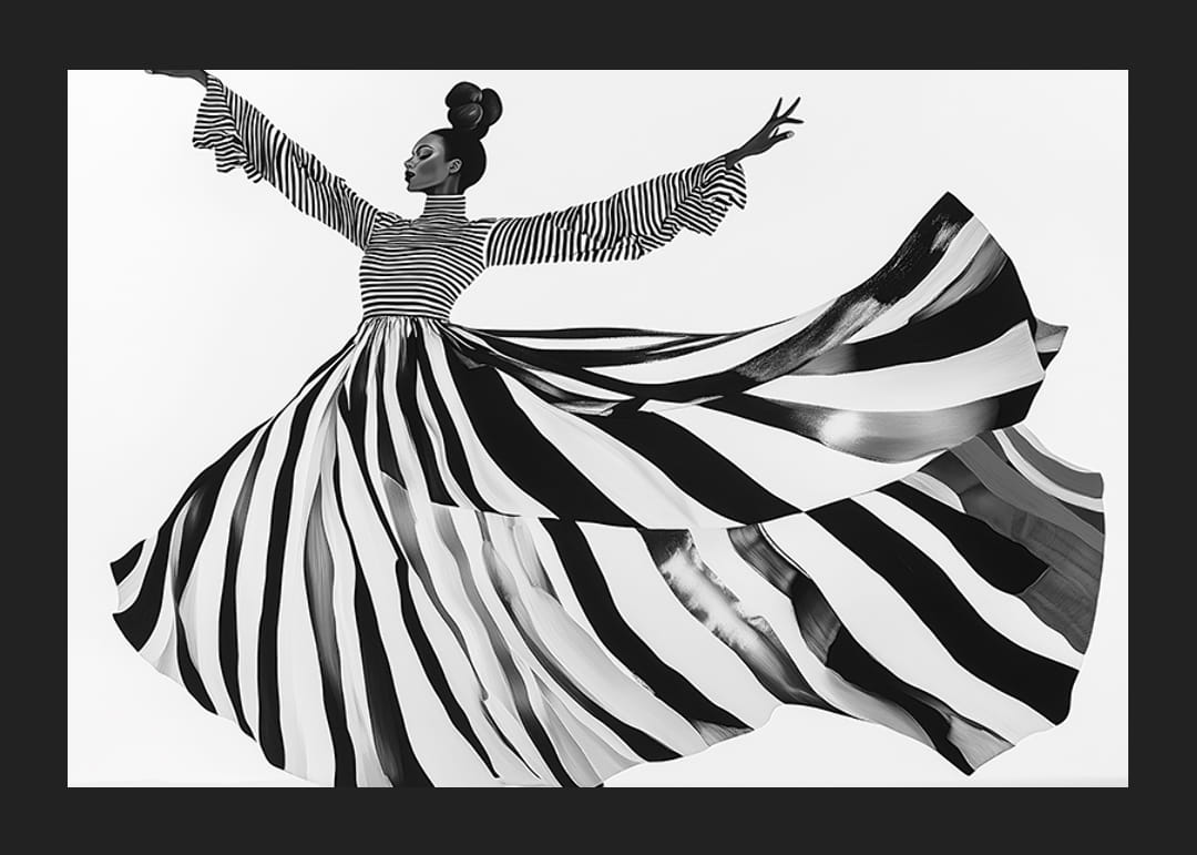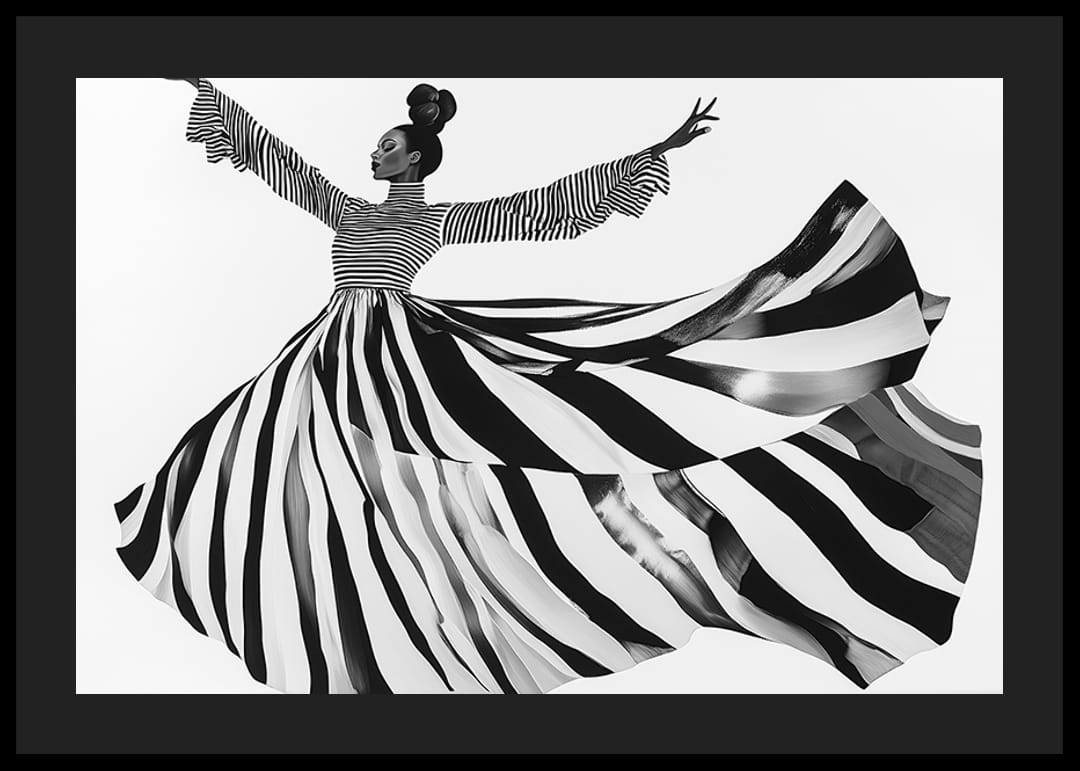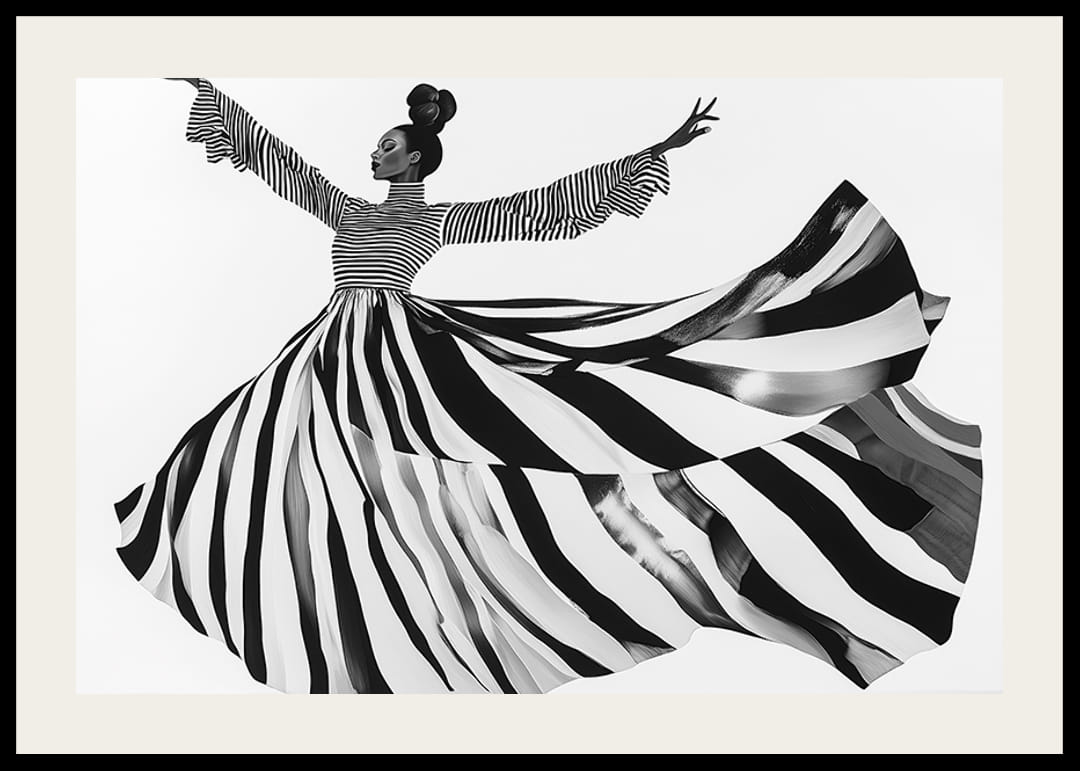 Com uma simplicidade cativante, este póster capta listras pretas e brancas numa dança hipnótica. O contraste cria um movimento dinâmico que parece flutuar e girar num momento de elegância intemporal.