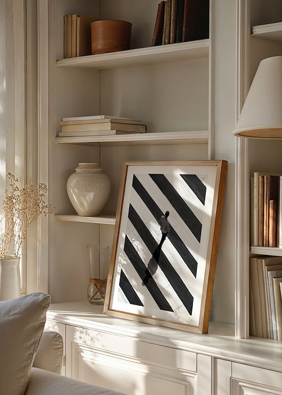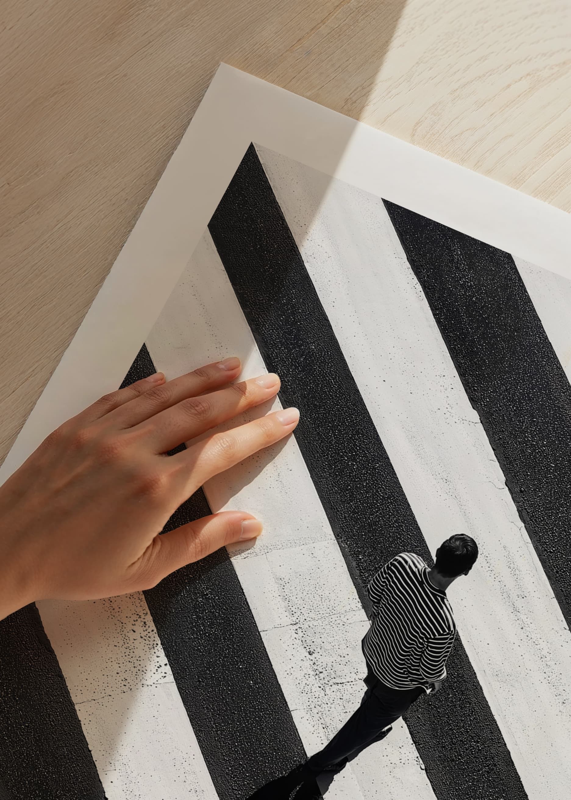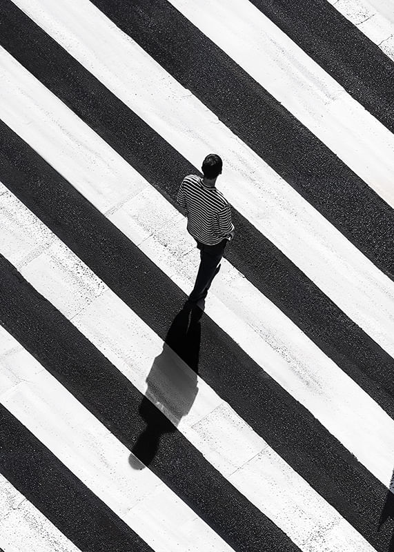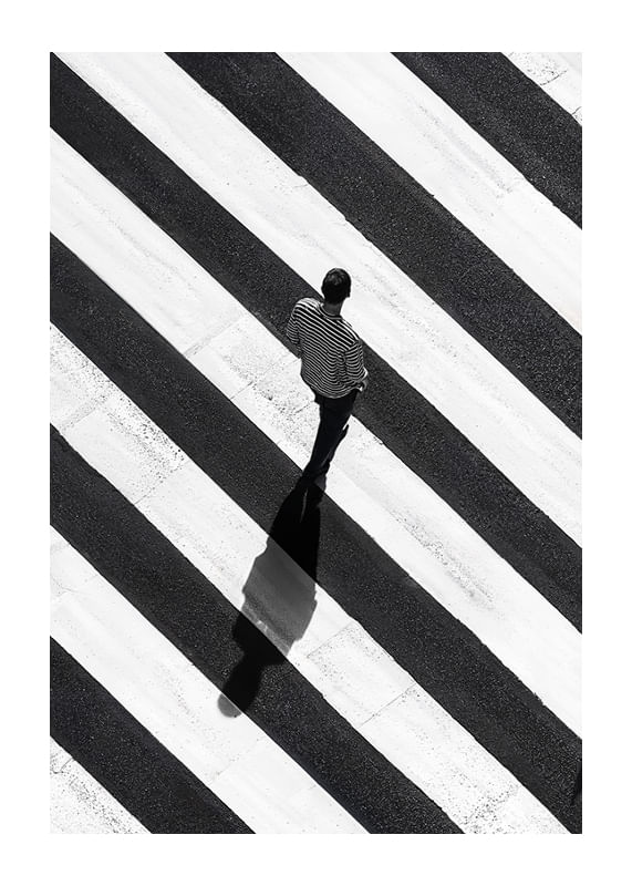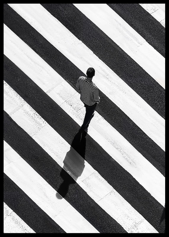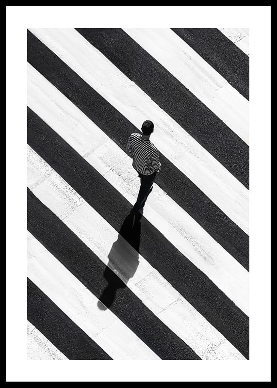 Este cartaz capta um homem solitário a caminhar por uma faixa de peões dramaticamente listrada. O contraste entre o preto e o branco do homem e as riscas largas cria uma sensação de solidão e reflexão.