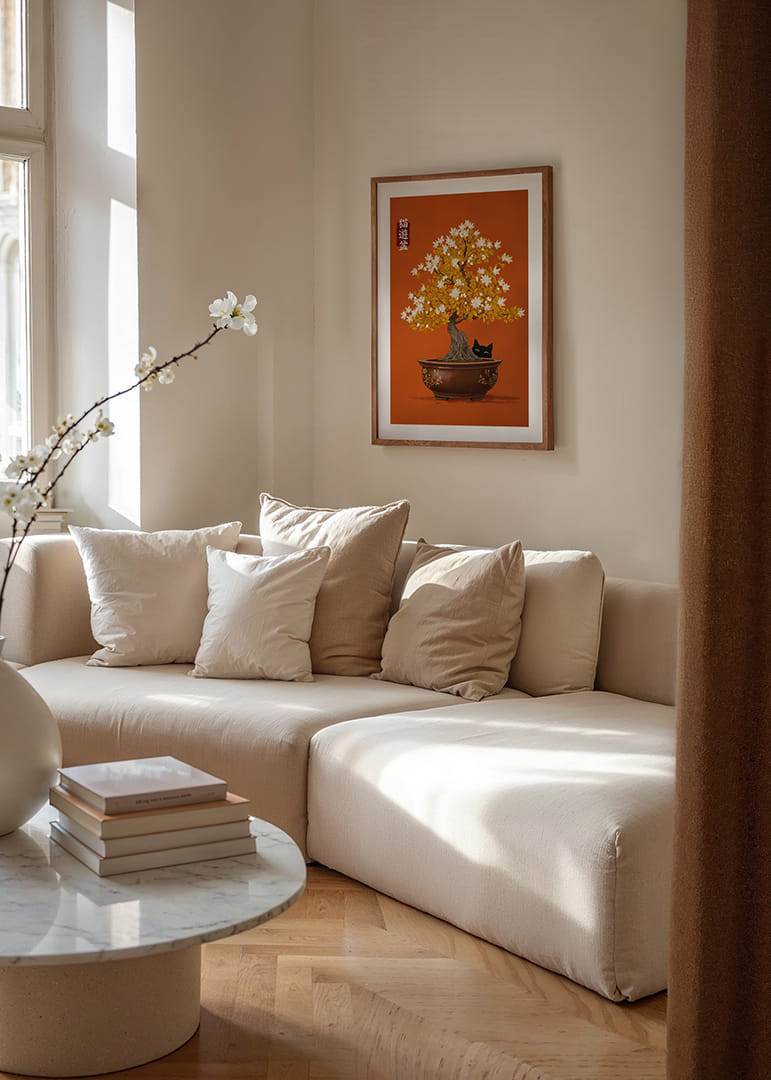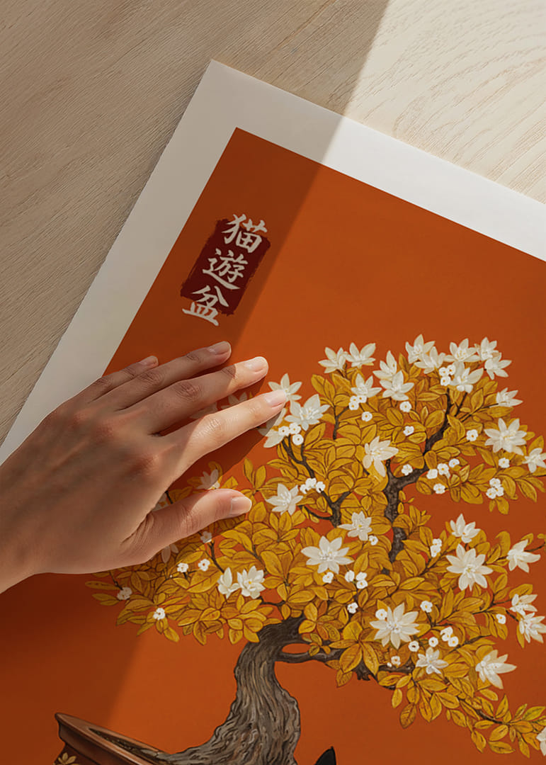 Com uma aura encantadora, este poster cativa o olhar com a sua elegante composição de um bonsai dourado a brilhar sobre um fundo quente, onde espreita um misterioso gato preto. As flores brancas e os detalhes da árvore transmitem uma sensação de calma e mistério. A expressão elegante do cartaz enriquecerá qualquer ambiente e trará uma combinação única de beleza e profundidade misteriosa à decoração da sua casa.