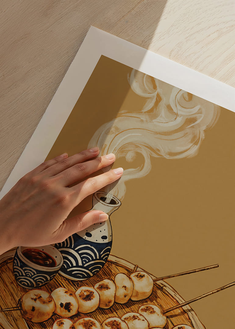 Este cartaz chama imediatamente a atenção com as suas iguarias fumegantes: bolinhos fritos dourados e um bule de chá tradicional. Os remoinhos de vapor reforçam a sensação de aconchego e cultura. Os tons harmoniosos de castanho e bege criam um ambiente acolhedor que irá valorizar qualquer cozinha ou sala de jantar. O design artístico do póster evoca tranquilidade e apetite, tornando-o uma peça decorativa perfeita.