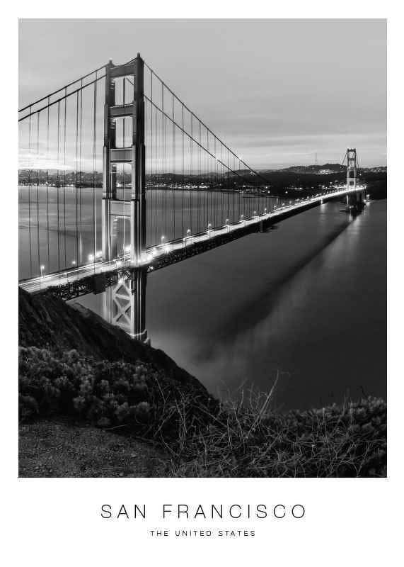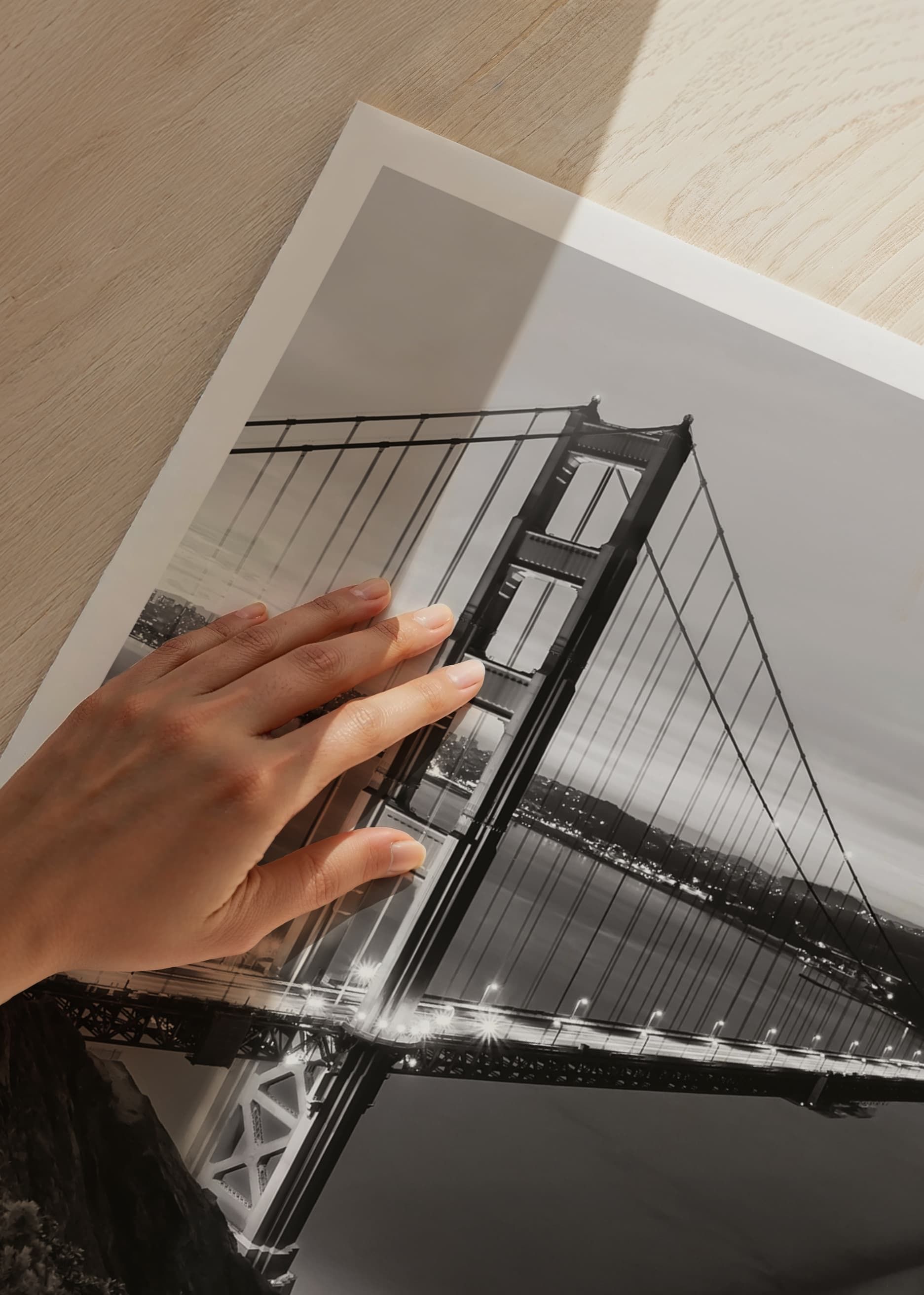 A Ponte Golden Gate atravessa as águas de São Francisco, Califórnia, capturada em uma fotografia em preto e branco onde o contorno da cidade e a luz da ponte se refletem na baía. As linhas e a perspectiva criam uma sensação de espaço e movimento. Este pôster adiciona um toque metropolitano atemporal a qualquer ambiente.