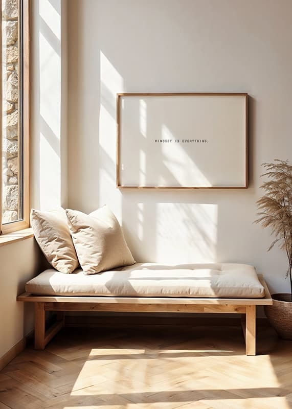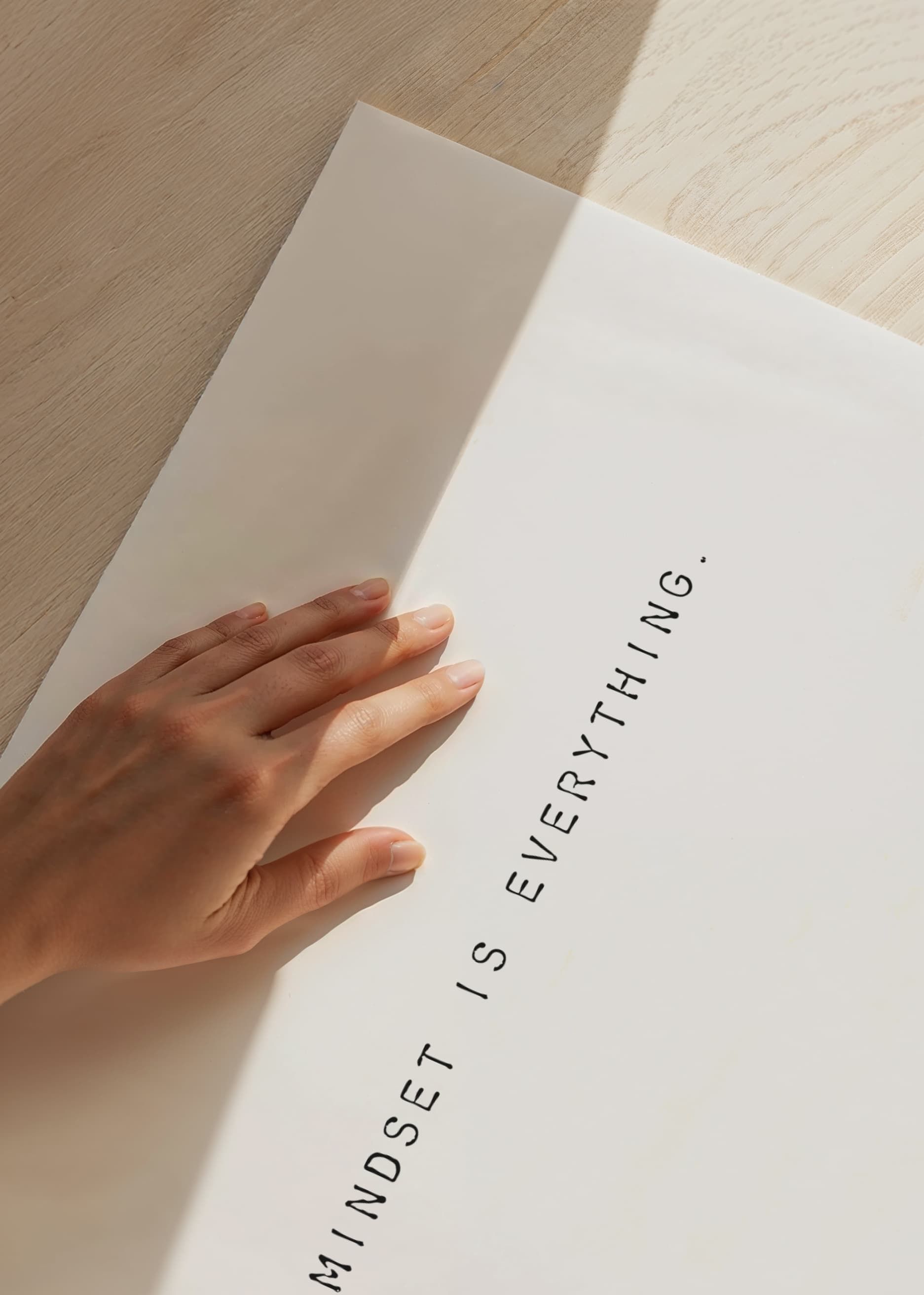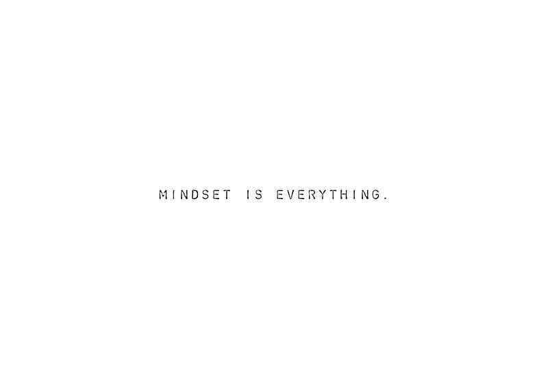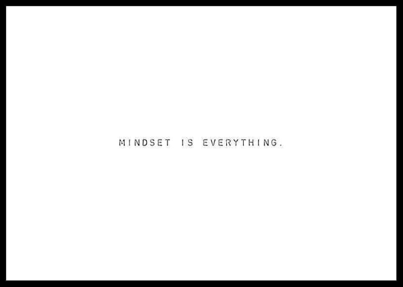 Texto preto com as palavras "MINDSET IS EVERYTHING" (mentalidade é tudo), centralizado sobre fundo branco e com uma fonte elegante e fina. A expressão gráfica é despojada e moderna, conferindo ao pôster uma impressão de tranquilidade. Combina bem com o escritório ou a sala de estar, onde detalhes simples e inspiradores são valorizados.