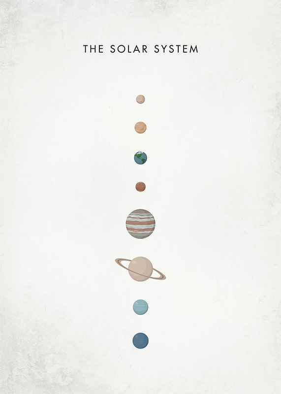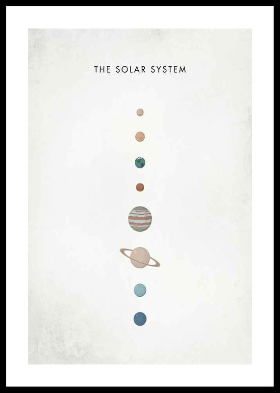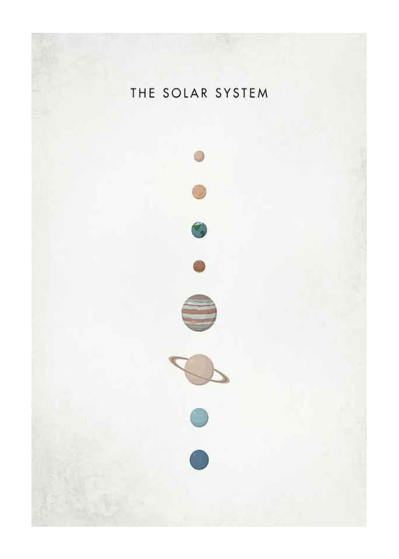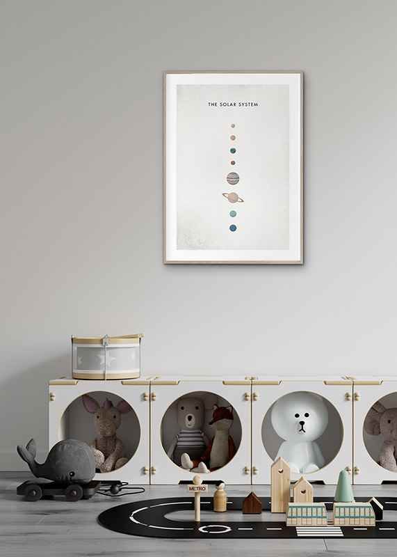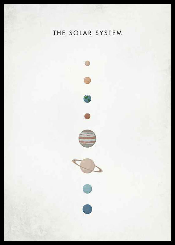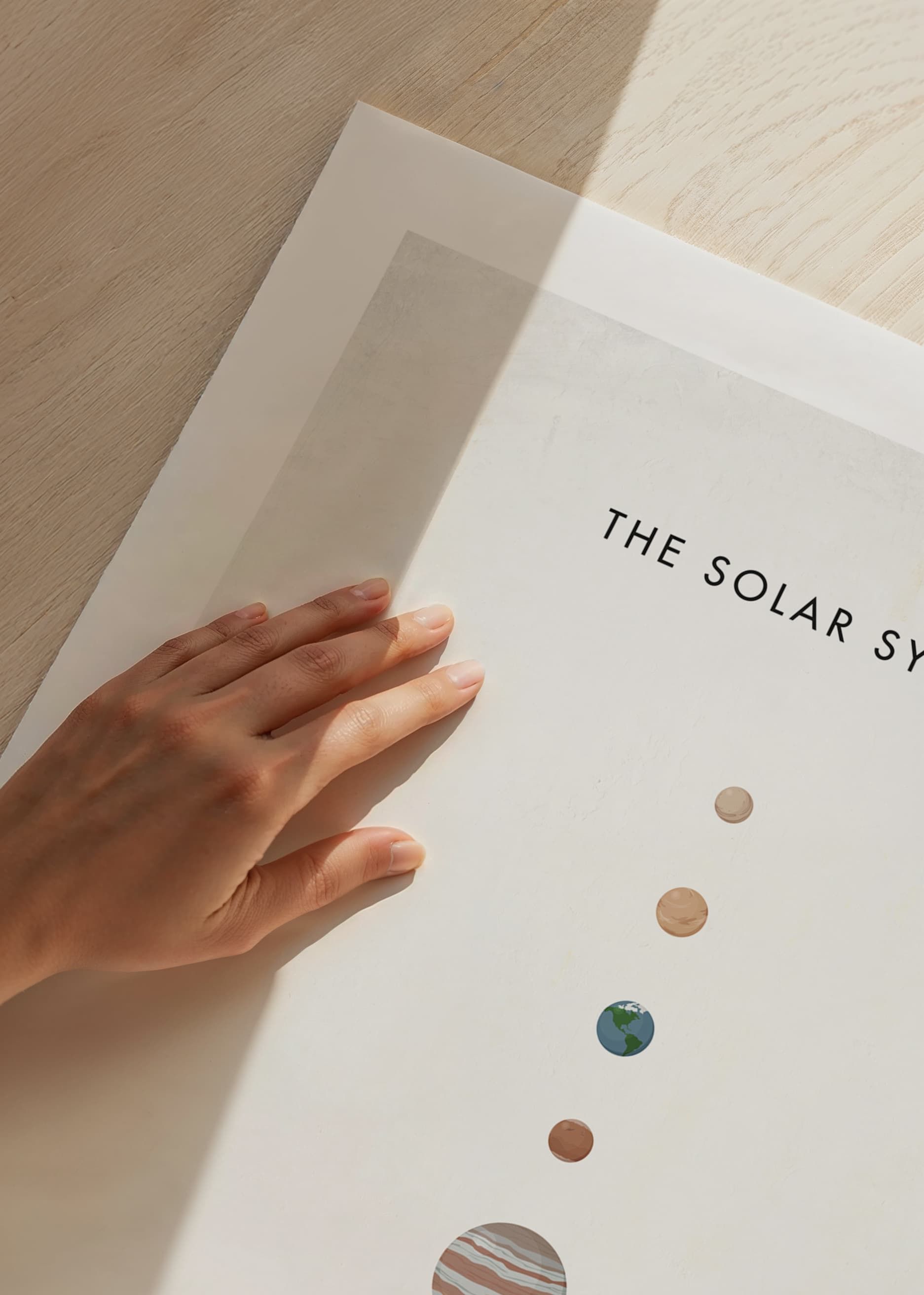 O tema consiste nos planetas do sistema solar alinhados verticalmente em uma forma estilizada e minimalista. As cores verde e azul da Terra são claramente visíveis entre os outros planetas em tons suaves de marrom, cinza e azul sobre um fundo claro e texturizado. O pôster proporciona uma expressão gráfica e educativa que adiciona um toque científico moderno ao ambiente.
