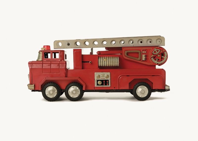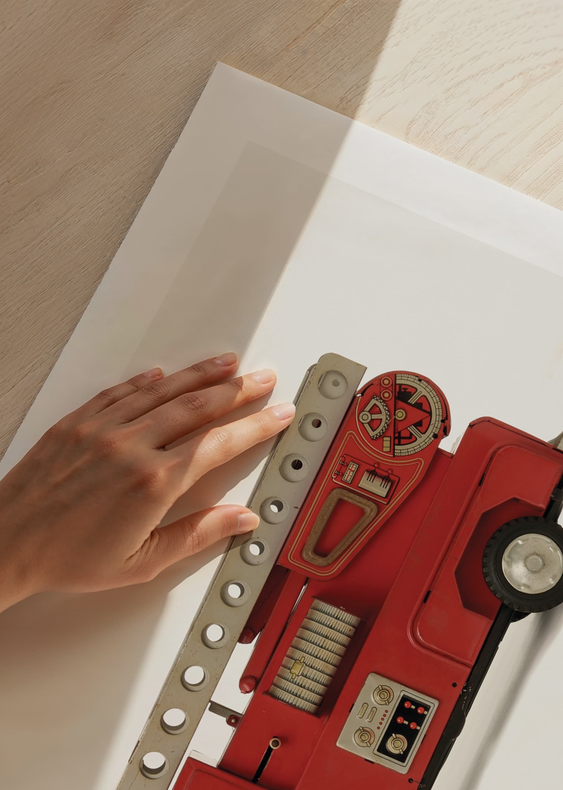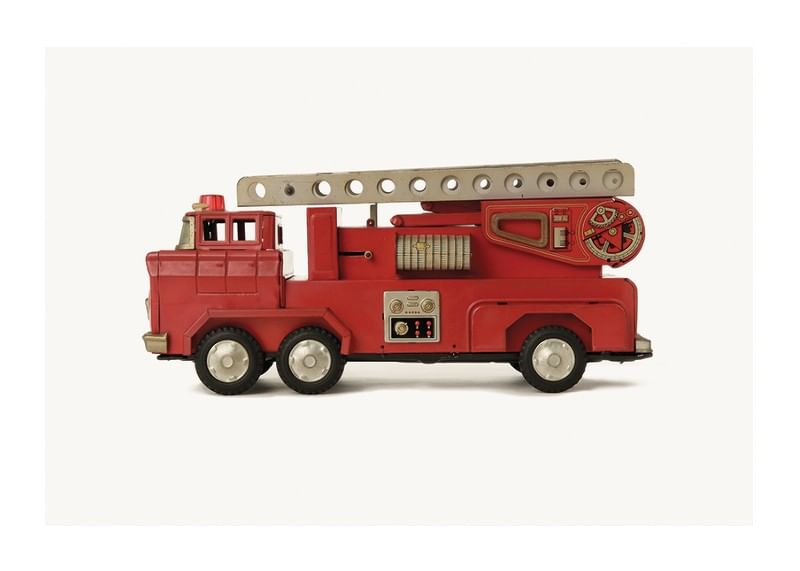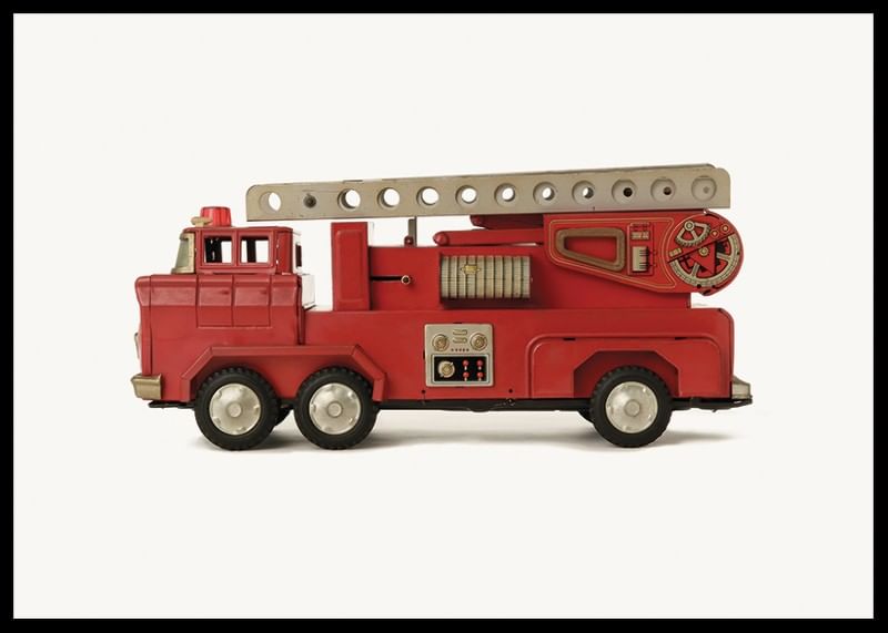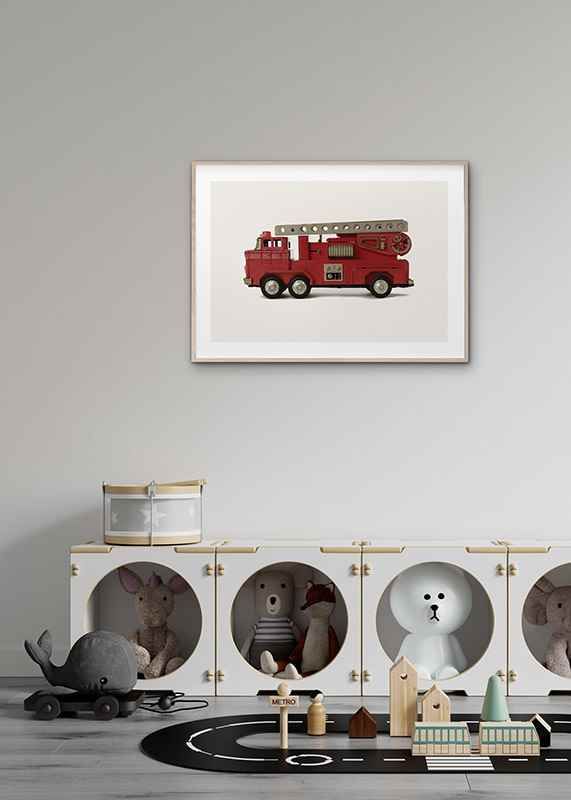 Caminhão de bombeiros de brinquedo detalhado em vermelho clássico com escada prateada e painéis de controle simples. O tema é centralizado em um fundo claro, quase branco, que confere um toque de estilo. Este pôster é particularmente adequado para quartos infantis ou salas de jogos e adiciona um toque lúdico e nostálgico ao interior.