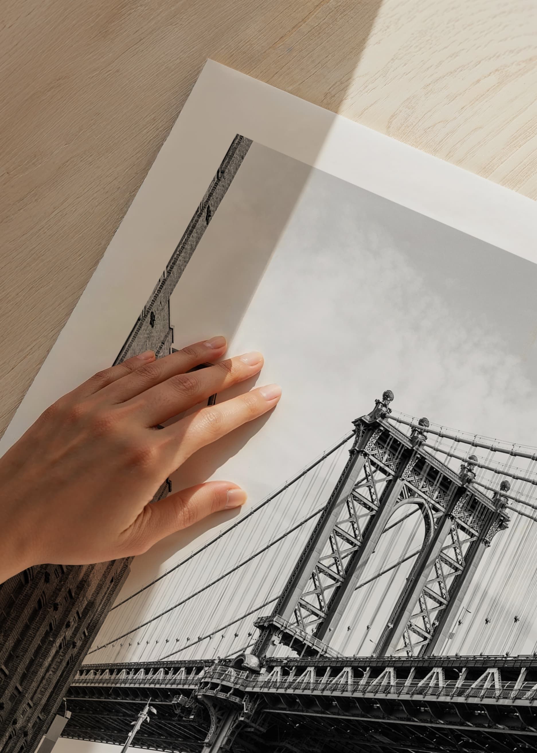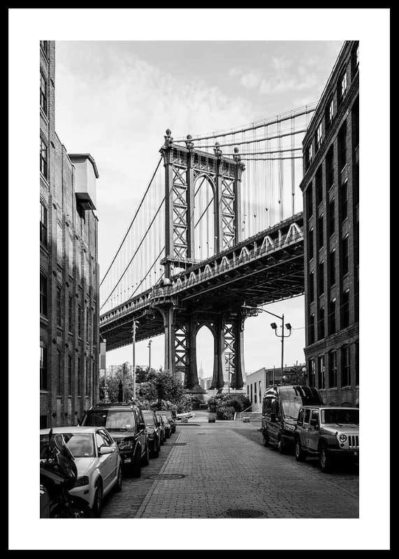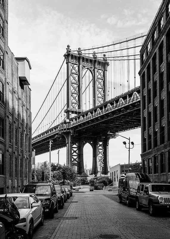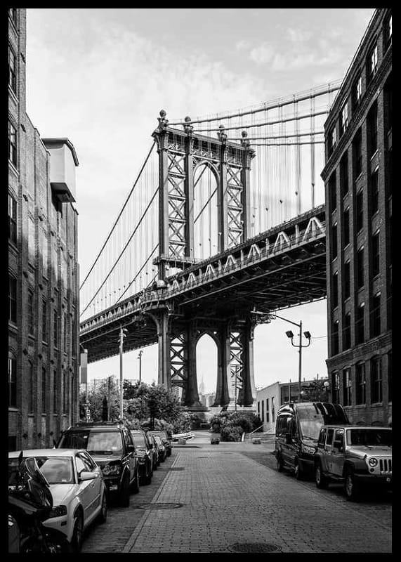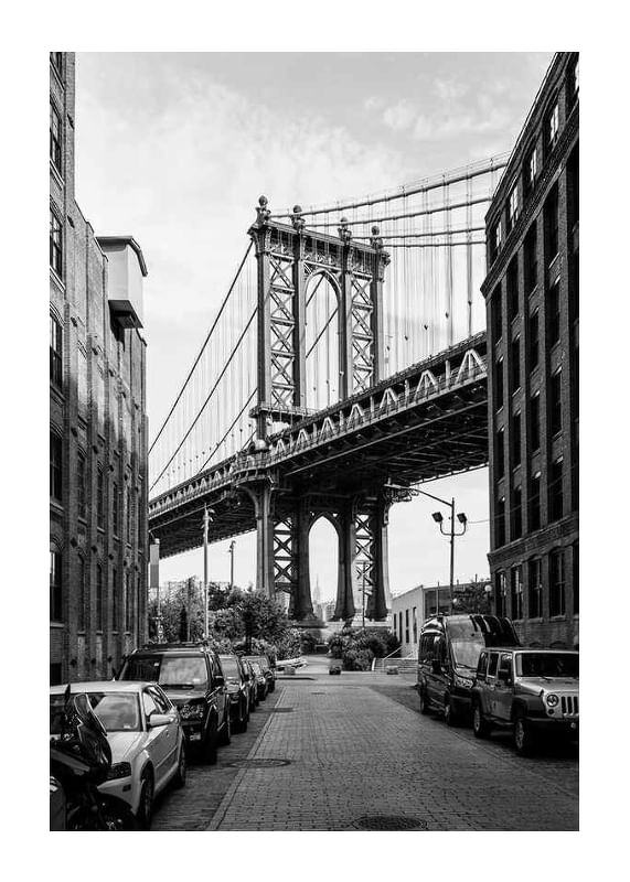 Uma rua da cidade ladeada por prédios de tijolos conduz o olhar para a Ponte de Manhattan, o centro das três pontes entre Manhattan e o Brooklyn, em Nova York. Carros estacionam ao longo das calçadas e os detalhes da estrutura de aço se destacam claramente através do esquema de cores preto e branco. Com seu tema urbano, este pôster adiciona um toque clássico de Nova York a ambientes residenciais modernos.