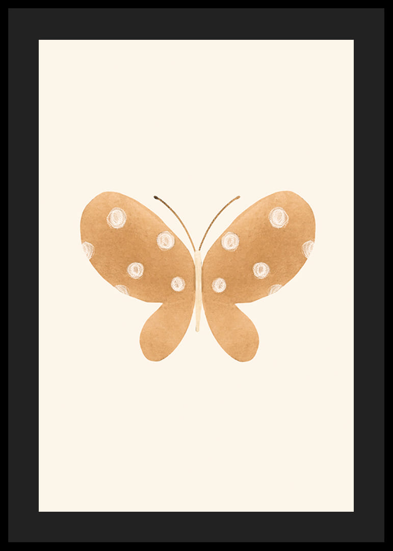 O tema consiste em uma borboleta marrom estilizada com bolinhas brancas redondas nas asas, posicionada centralmente sobre um fundo bege claro e sólido. As formas simples e as cores suaves criam uma expressão suave que combina perfeitamente com quartos infantis. Este pôster contribui com um elemento calmo e lúdico para o interior.