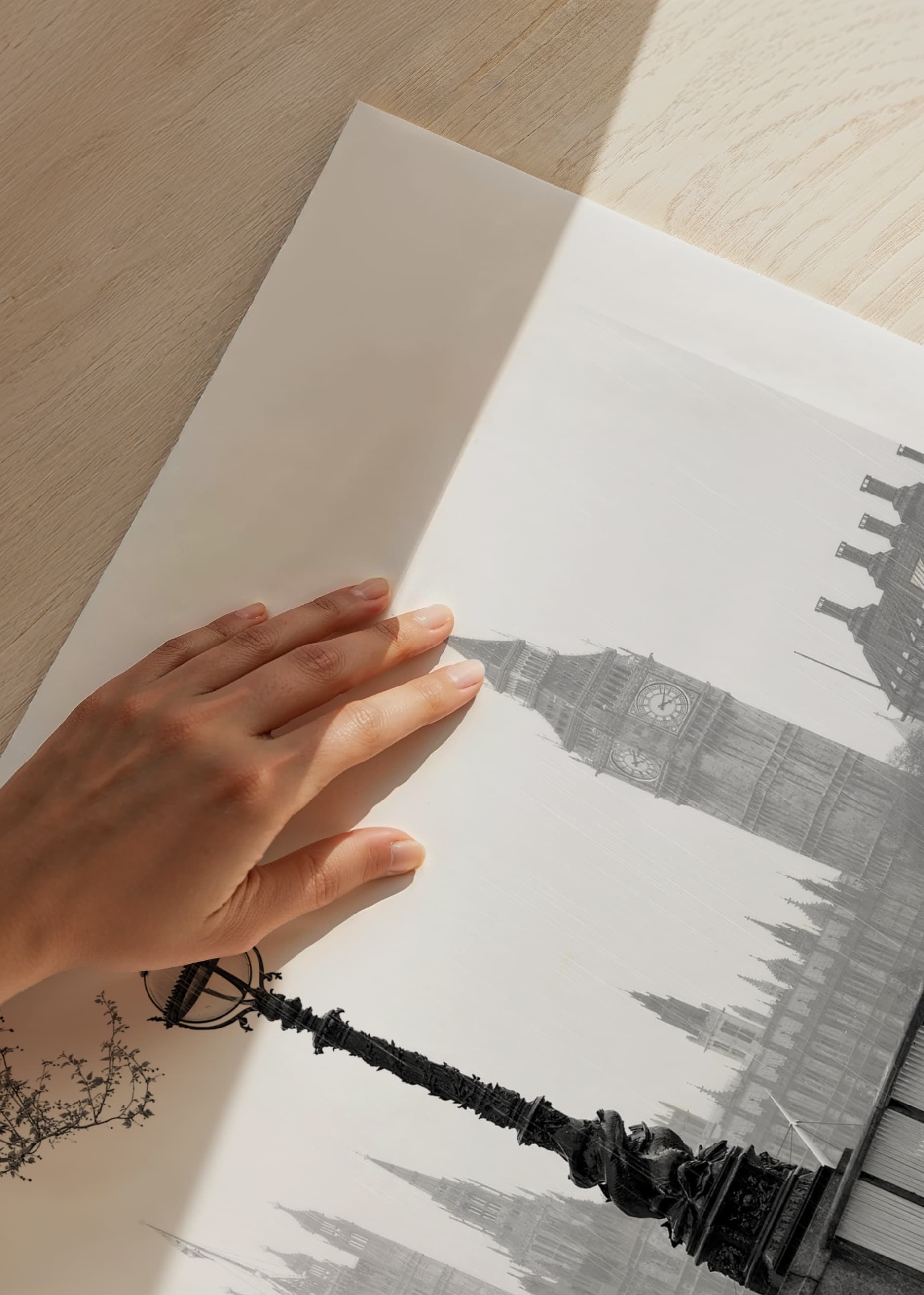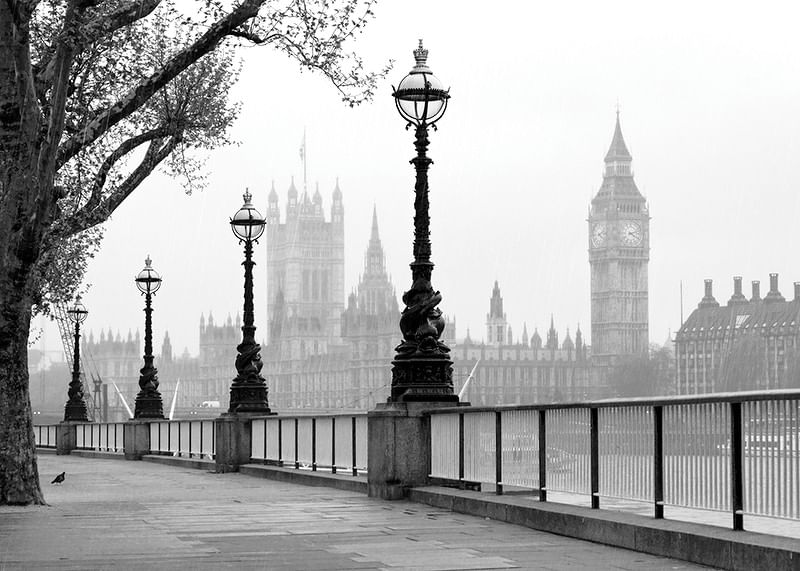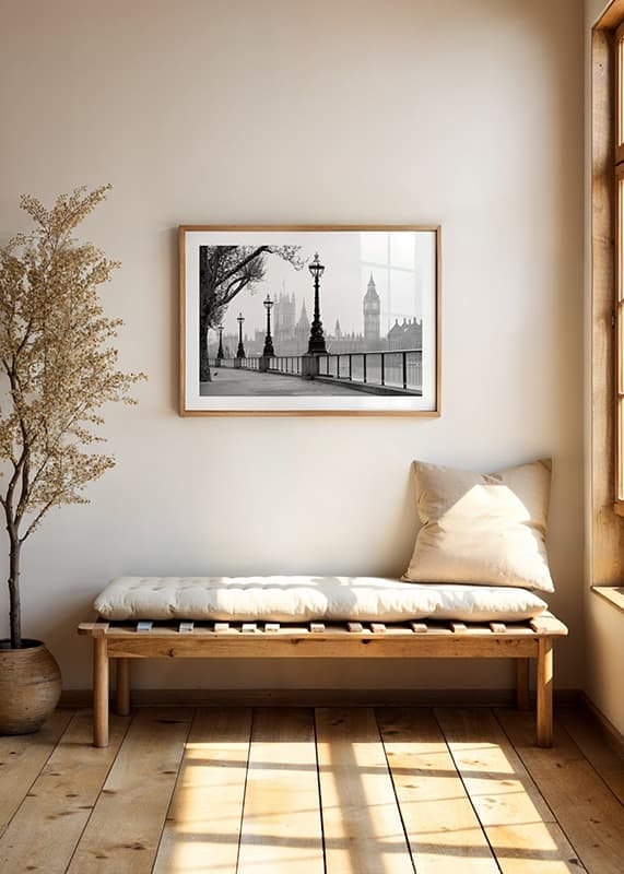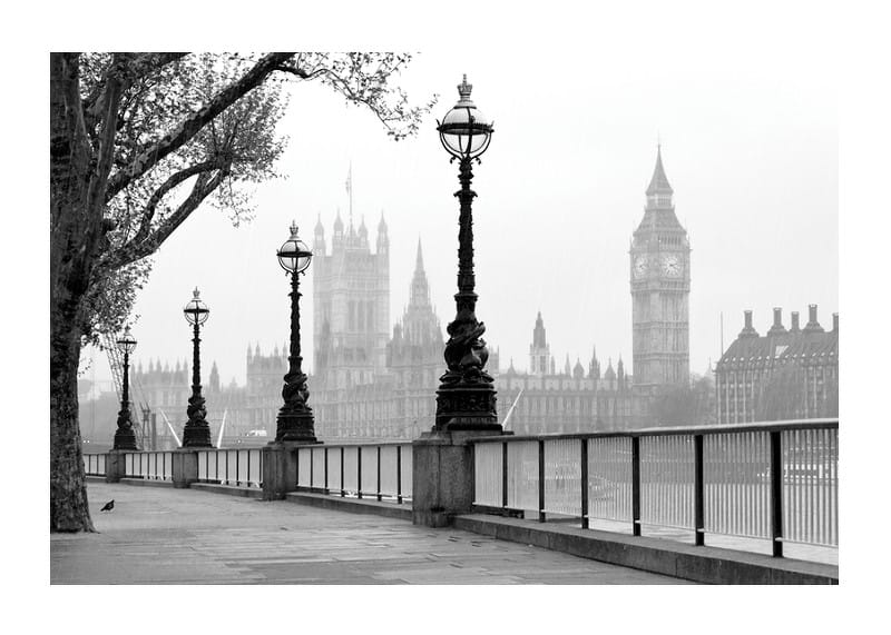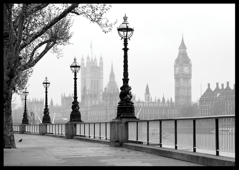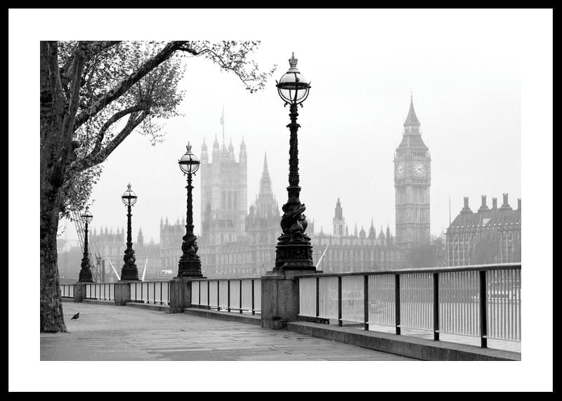 Postes de luz ladeiam a margem sul do Rio Tâmisa, em Londres, com a silhueta da Torre Elizabeth e do Palácio de Westminster ao fundo. Tons monocromáticos destacam a arquitetura histórica da cidade e a calma luz da manhã. Este pôster tem um toque atemporal e é perfeito para uma sala de estar, corredor ou escritório.