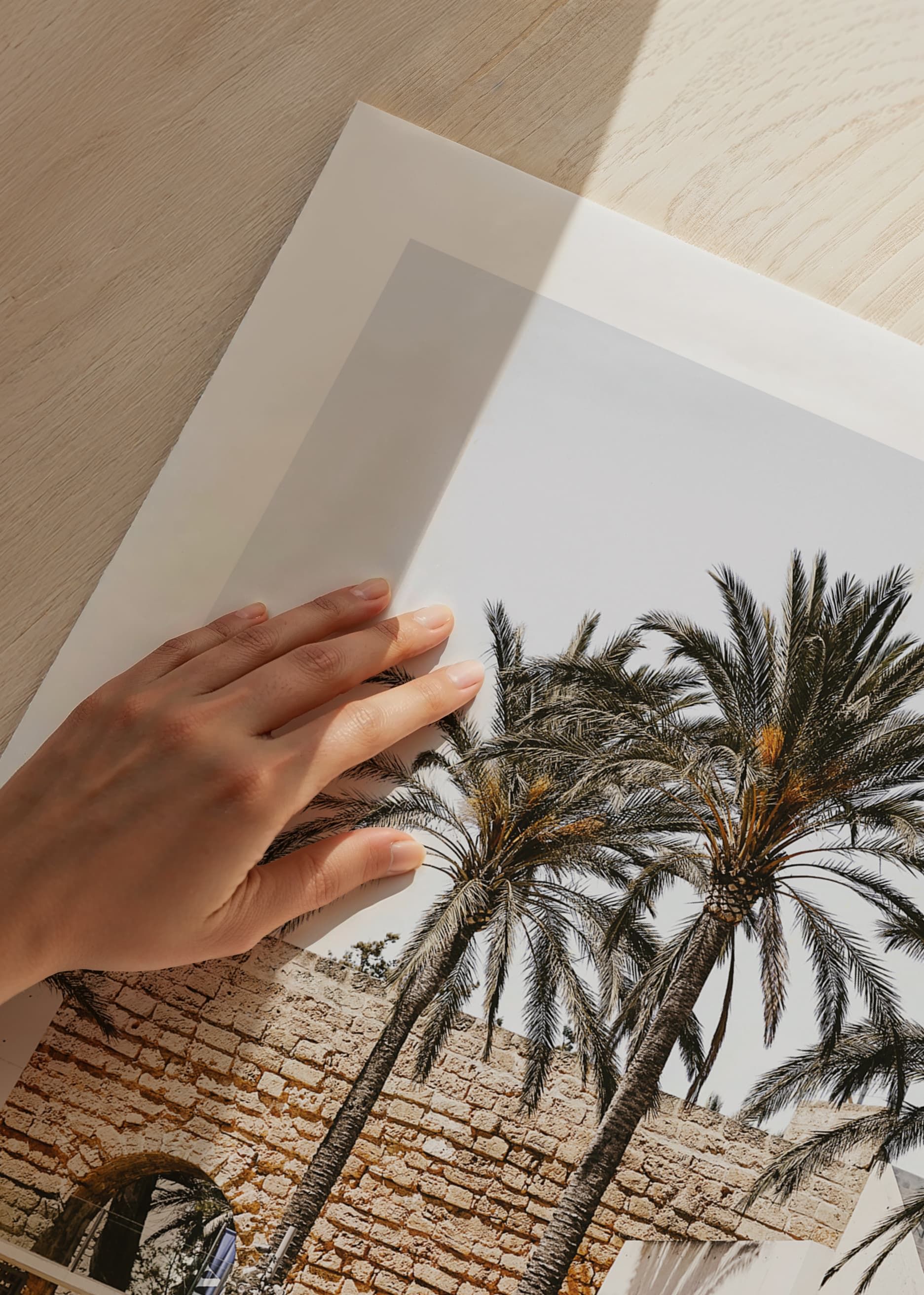 Palmeiras altas se erguem contra um céu claro em frente a um muro de pedra clássico com um arco destacado e uma escadaria de gesso branco. Tons naturais de terra se unem a contrastes claros entre vegetação e arquitetura. Um pôster com um tema de Maiorca que evoca o Mediterrâneo e combina com ambientes que desejam uma sensação de verão e desejo de viajar.