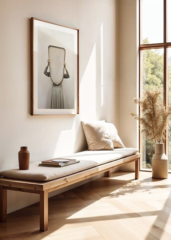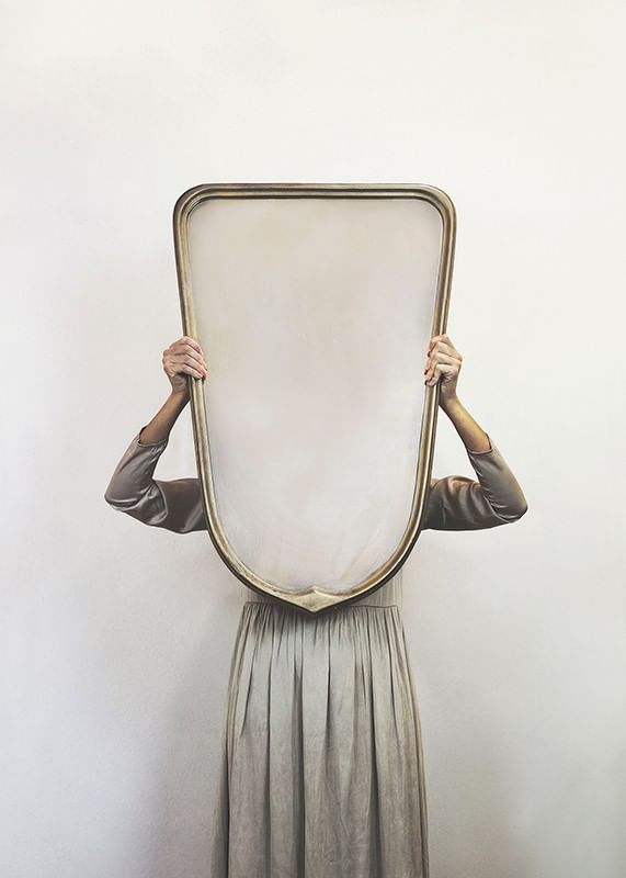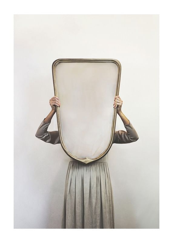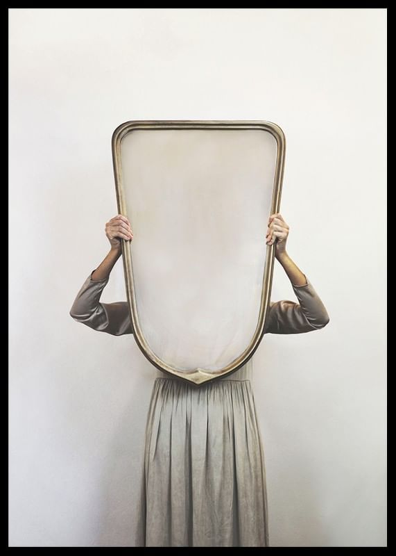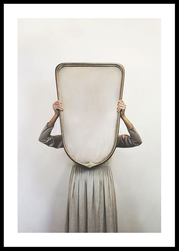 O motivo mostra uma mulher com um vestido cinza de mangas compridas segurando um grande espelho diante do rosto. A superfície do espelho é difusa e desfocada, o que esconde seus traços faciais e cria uma sensação conceitual. Cores opacas e um fundo minimalista conferem ao pôster uma expressão moderna. Adequado para ambientes com foco na reflexão e no pensamento.