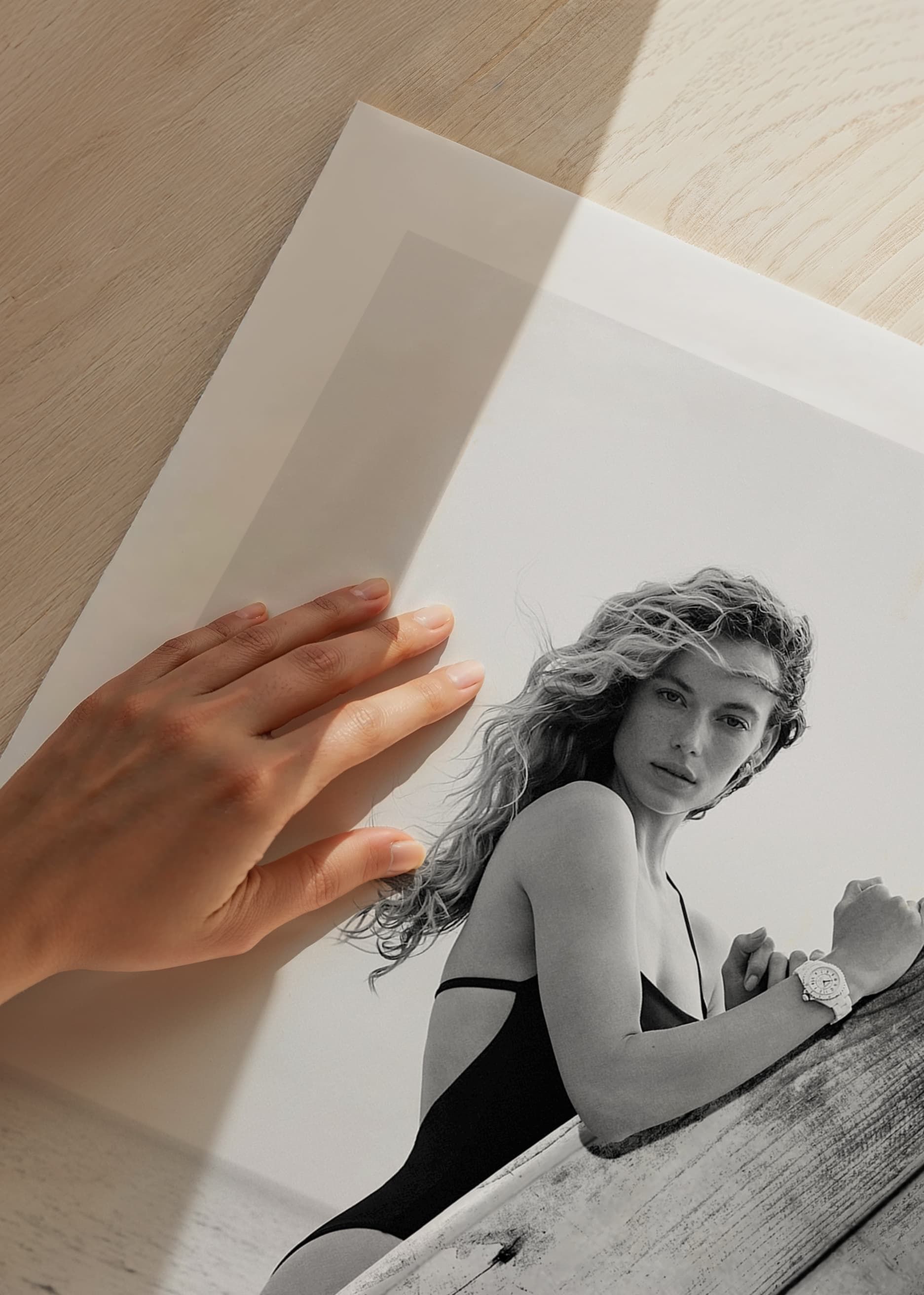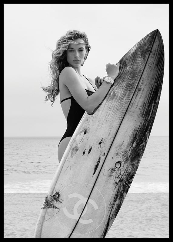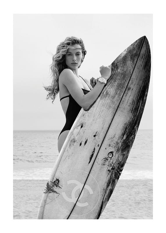 Uma jovem de maiô preto está à beira-mar, encostada em uma prancha de surfe desgastada. A imagem é em preto e branco e tem claras influências da moda, com o logotipo da Chanel discretamente posicionado na frente. Este pôster combina expressões esportivas e elegantes e combina perfeitamente com um quarto, sala de estar ou closet modernos.