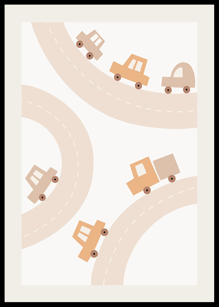 Carrinhos de brinquedo gráficos em diversos formatos e tamanhos percorrem estradas com curvas suaves sobre um fundo claro cor de areia. Os tons suaves de bege e marrom criam uma impressão calma e lúdica que combina perfeitamente com o quarto de uma criança. Este pôster adiciona uma escala de cores suave e um toque lúdico ao ambiente, sem ser muito dominante.