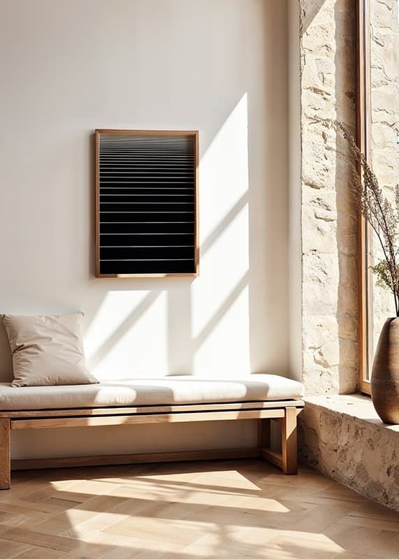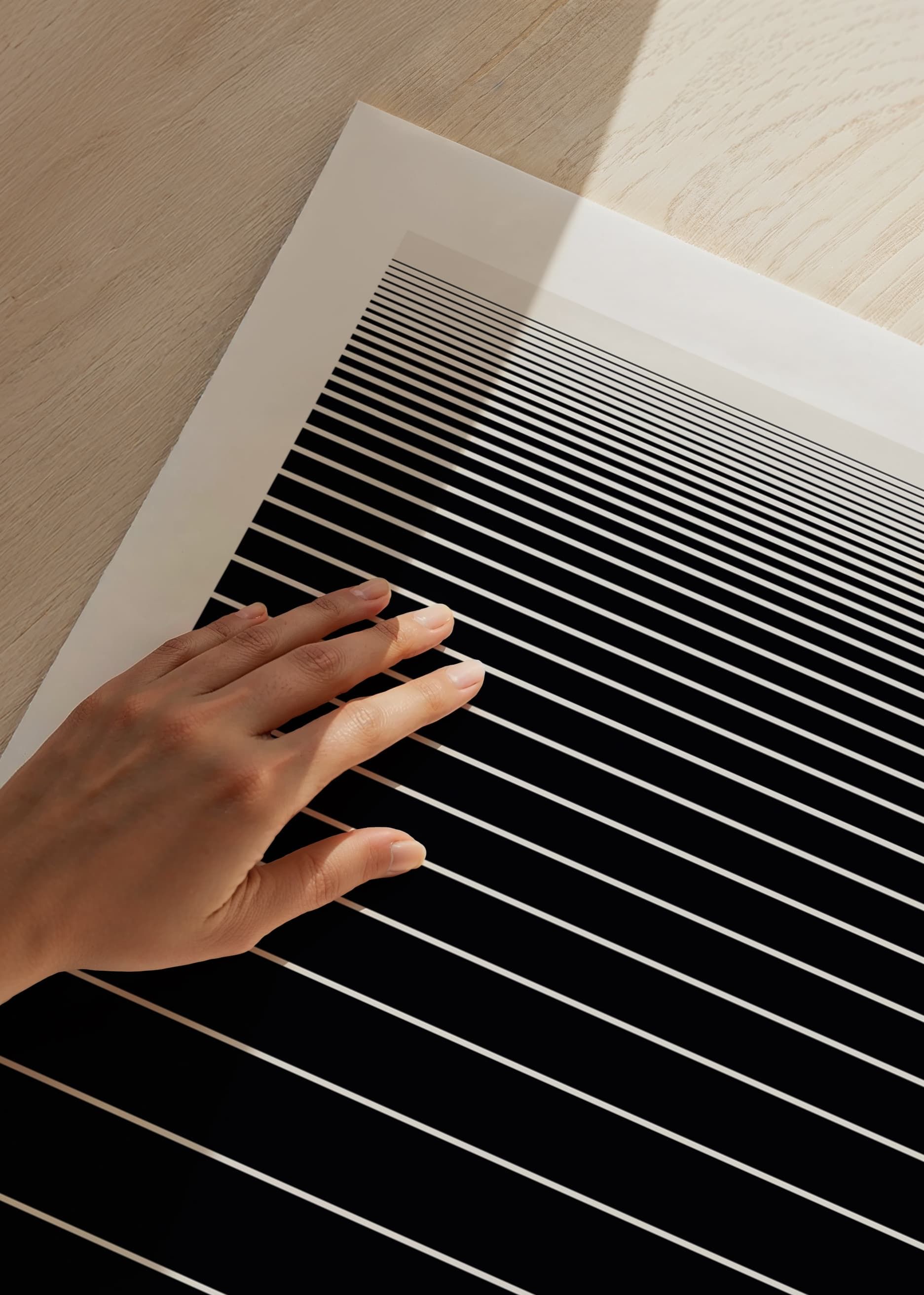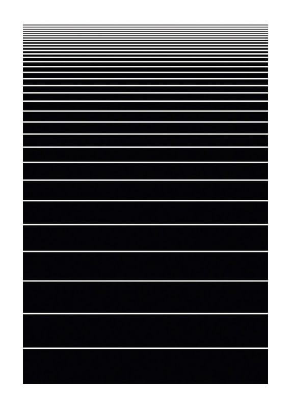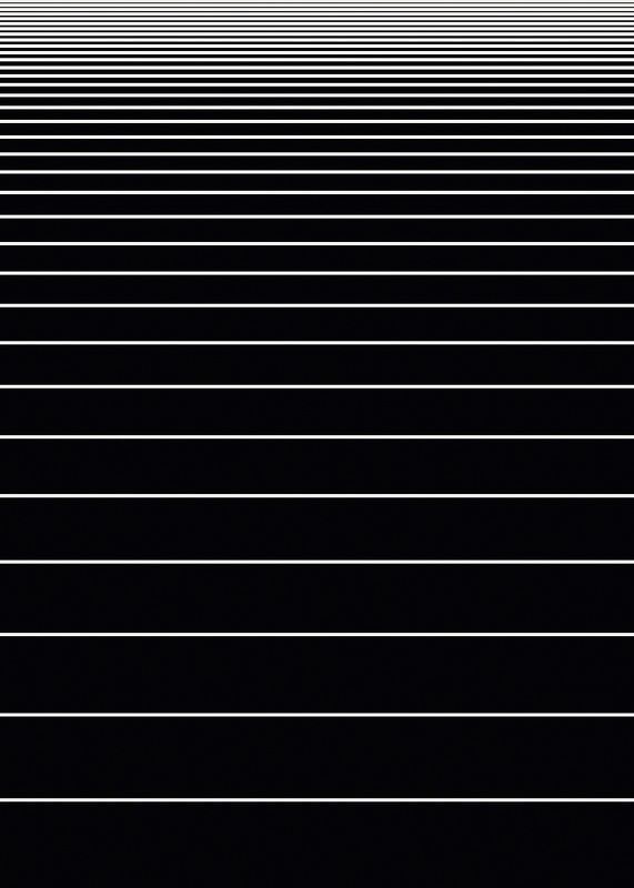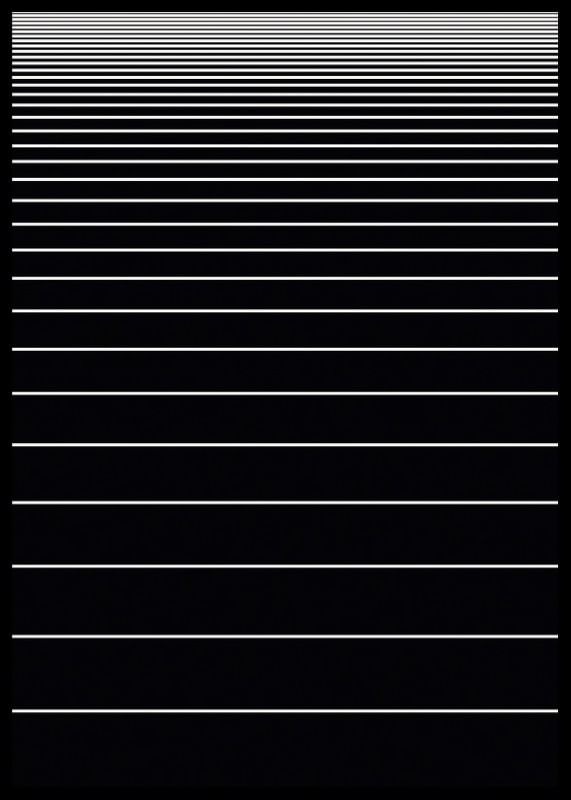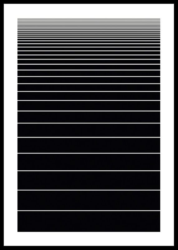 Linhas brancas horizontais em intervalos regulares formam um padrão gráfico sobre um fundo preto. As linhas são mais densas na parte superior, criando uma sensação de profundidade e perspectiva. Este pôster exala simplicidade e modernidade e é ideal para ambientes de trabalho ou sociais que buscam um ambiente elegante.