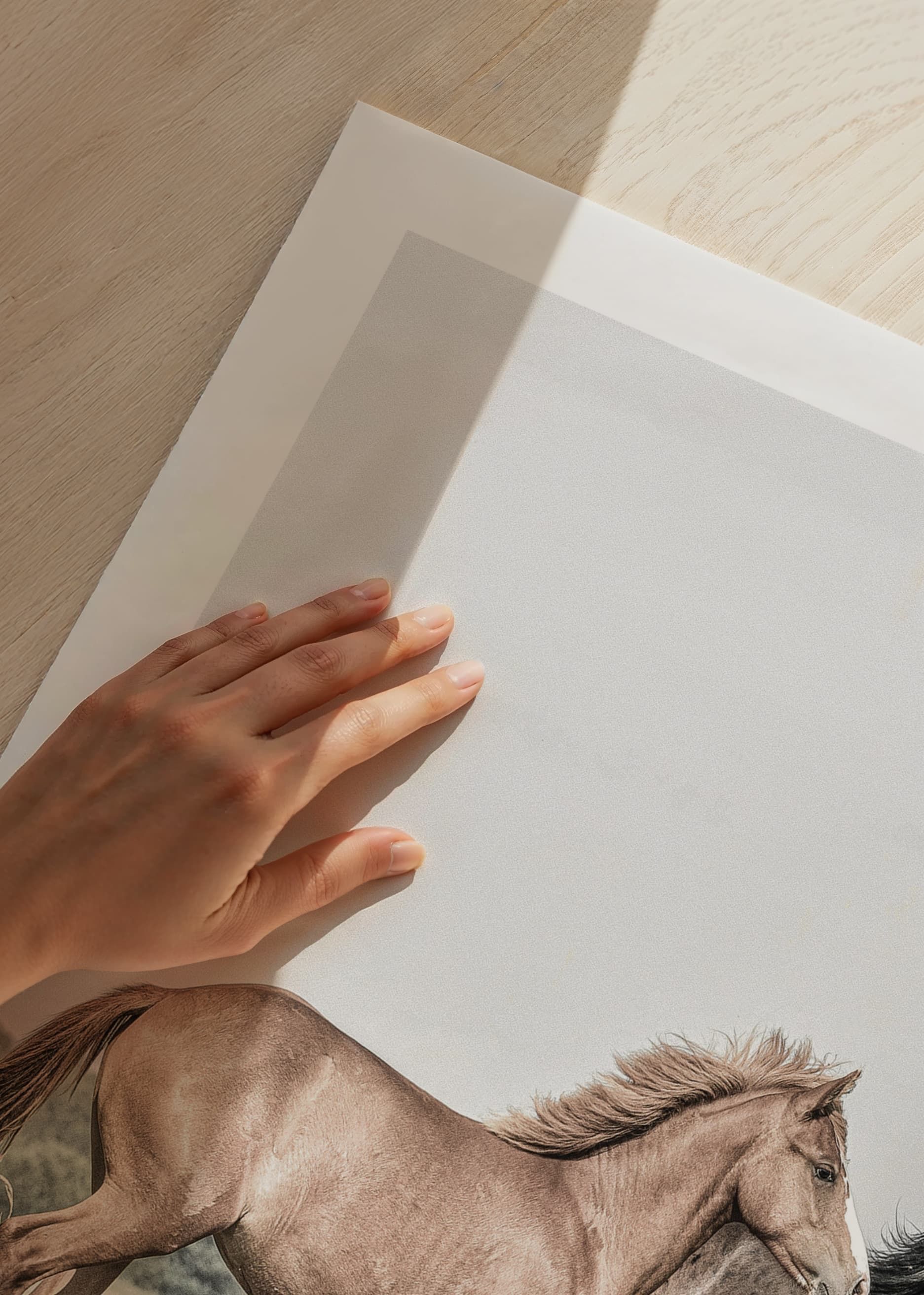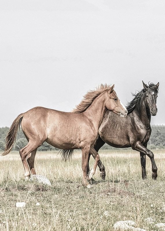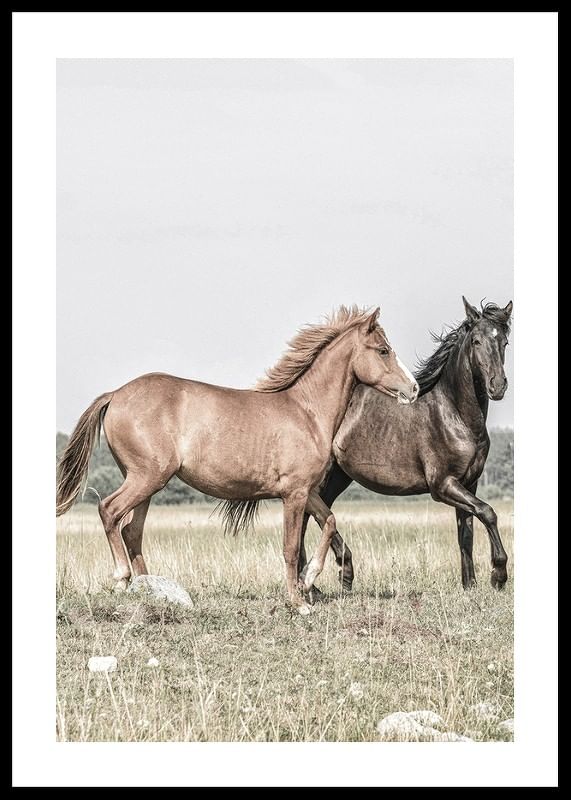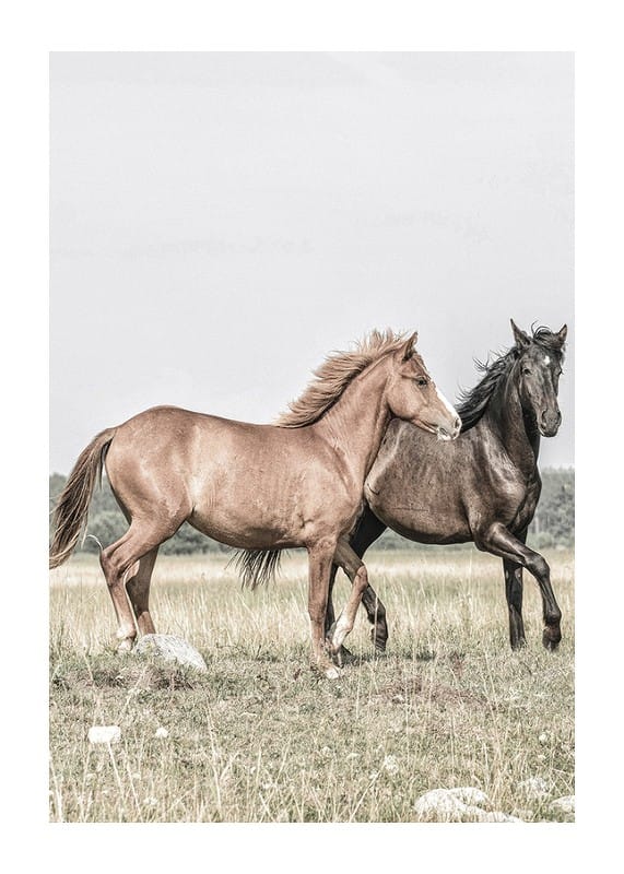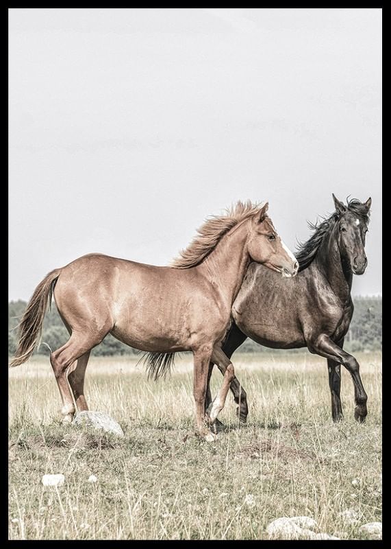 Dois cavalos, um castanho-claro e outro castanho-escuro, correm lado a lado em um campo aberto sob um céu claro. Os tons naturais suaves e discretos e a paisagem despojada criam uma impressão de paz. Este pôster é adequado tanto para salas de estar quanto para corredores, adicionando uma sensação de liberdade e movimento ao ambiente.