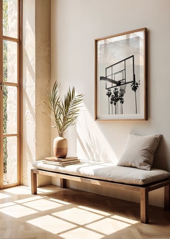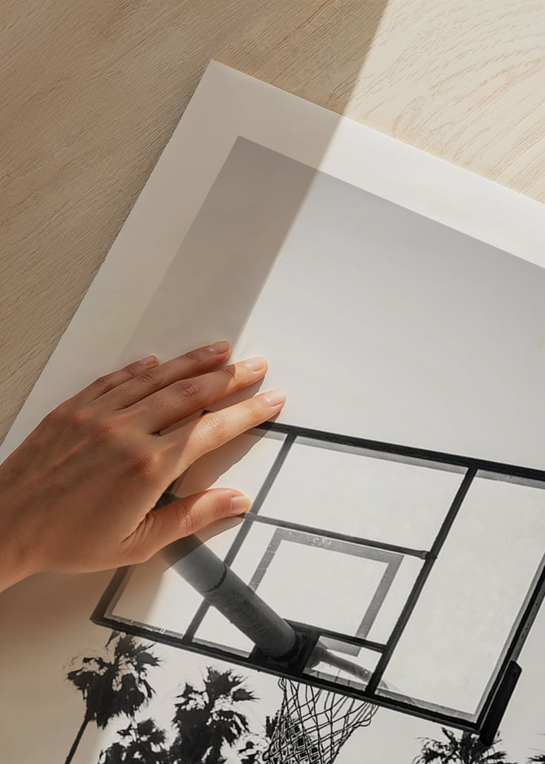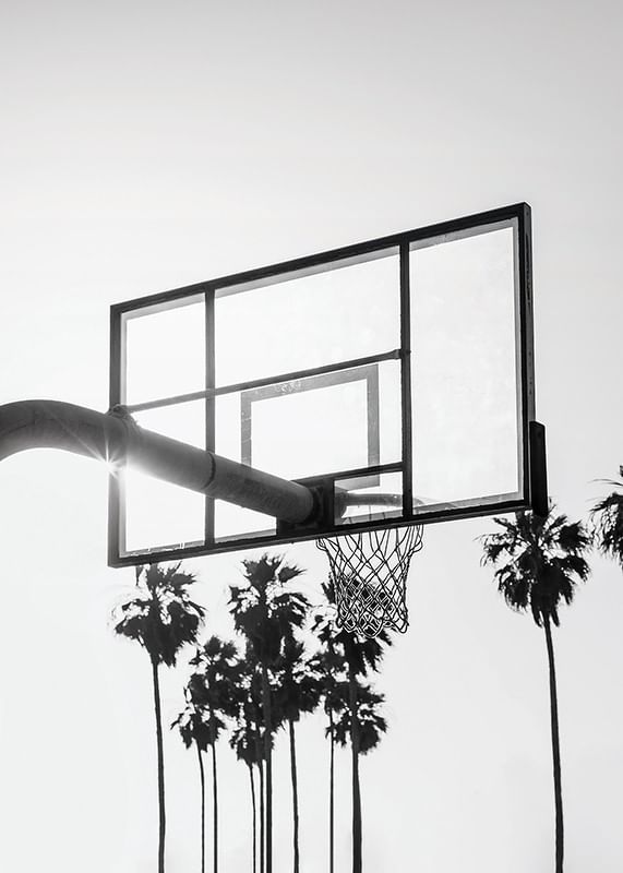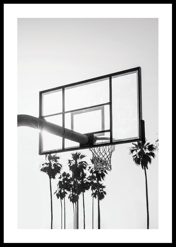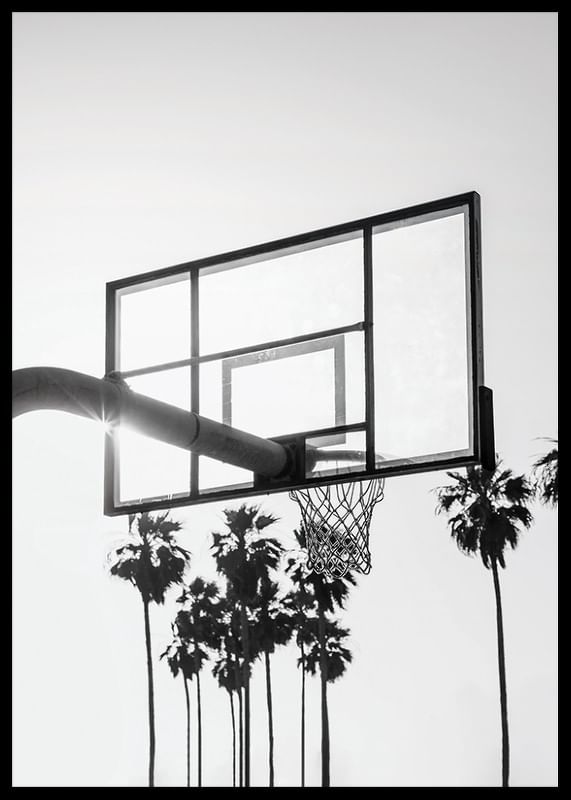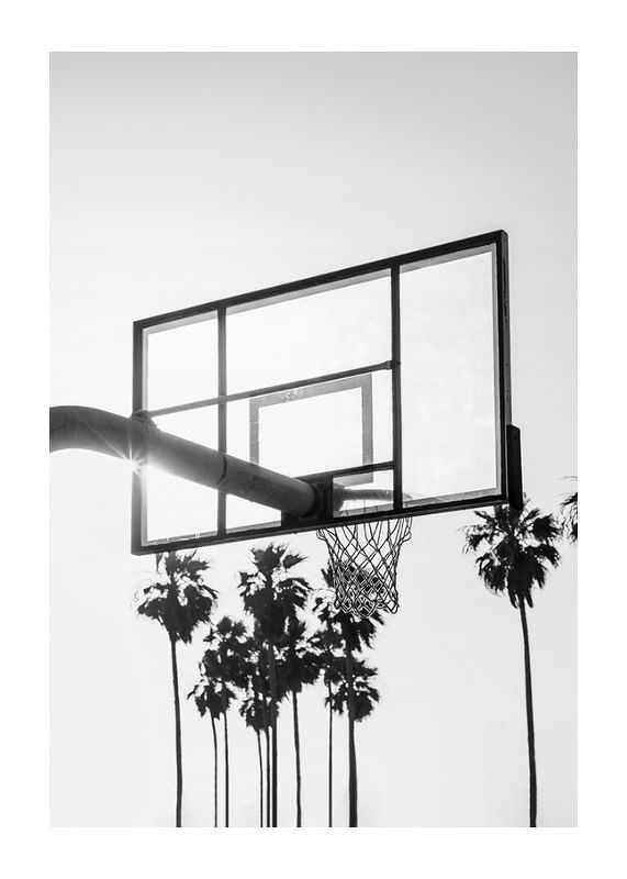 Uma cesta de basquete no alto, em silhueta contra um céu claro, onde o sol brilha através do tabuleiro, cercada por palmeiras altas ao fundo. O tema em preto e branco evoca o ambiente urbano de Los Angeles e confere uma expressão urbana e elegante. Um pôster que combina tanto com a sala de estar quanto com o escritório, criando um clima inspirado em esportes.