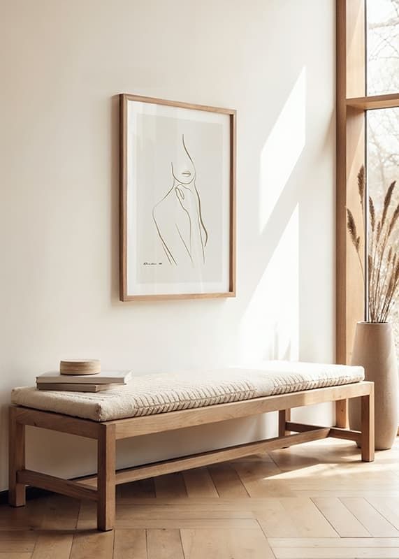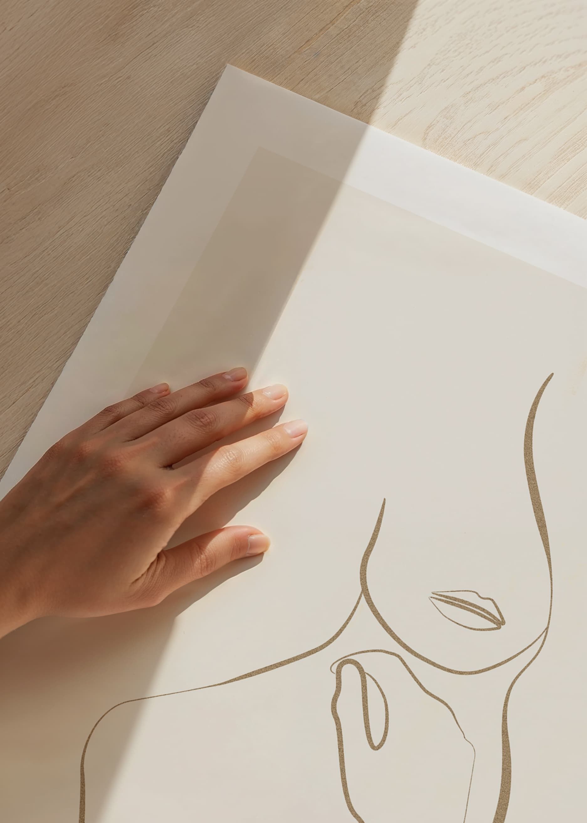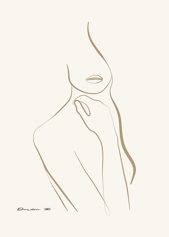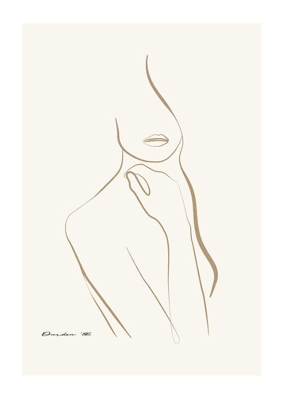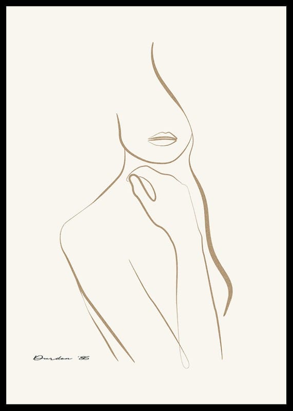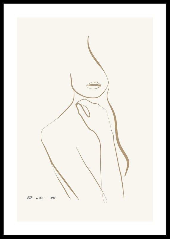 Um desenho simples mostra um torso feminino com contornos suaves em tons de bege sobre um fundo claro. Os traços faciais são simplificados e o foco está na forma e na expressão. O estilo minimalista torna o pôster ideal para ambientes onde se deseja uma atmosfera elegante e moderna.