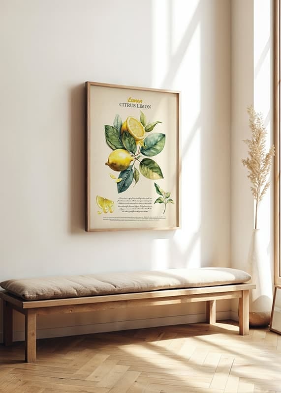 O design consiste em dois limões, um inteiro e um cortado, cercados por folhas verdes detalhadas em estilo aquarela sobre um fundo creme claro. Pequenas fatias de limão e um galho com uma flor completam o design. Um breve texto informativo sobre o limoeiro confere ao pôster um toque botânico, que combina perfeitamente com cozinhas e salas de jantar.