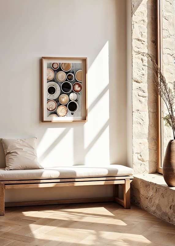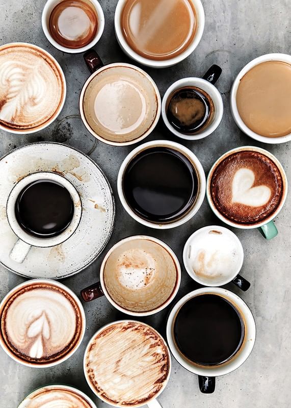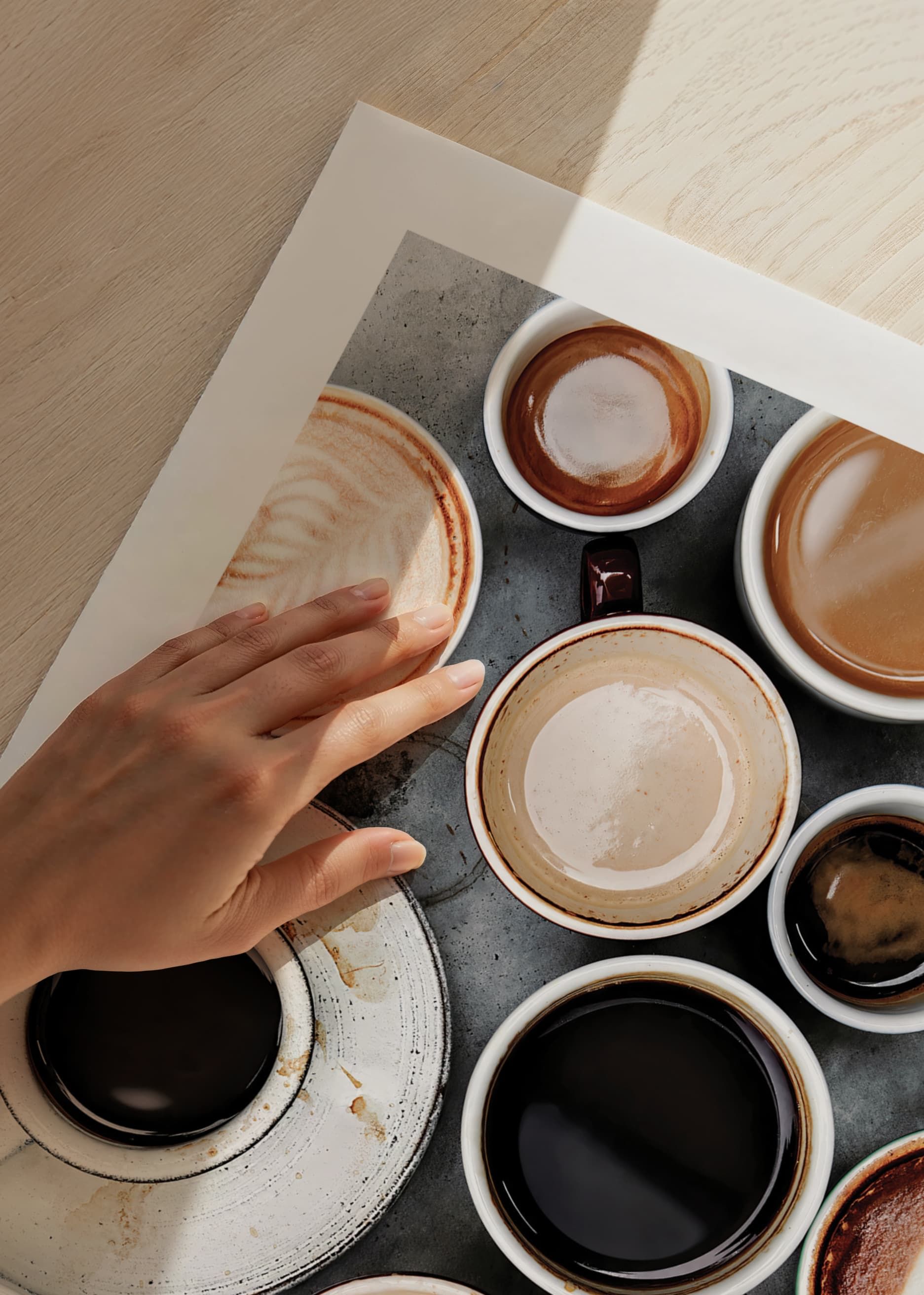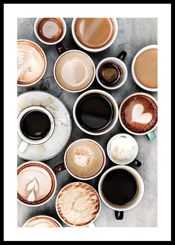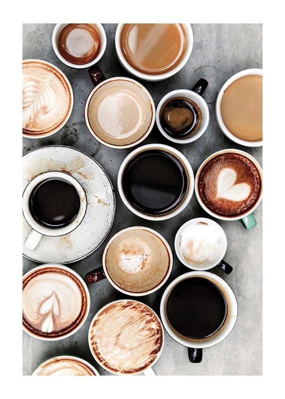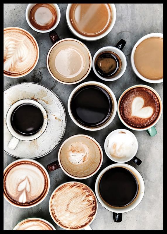 Várias xícaras de café com latte, cappuccino, expresso e café coado são vistas de cima, em tons variados, do bege claro ao marrom escuro. Corações de espuma, padrões e superfícies lisas dão vida ao tema. Este pôster cria uma sensação aconchegante na cozinha ou no cantinho do café e celebra a variedade e o artesanato presentes no cotidiano dos amantes de café.