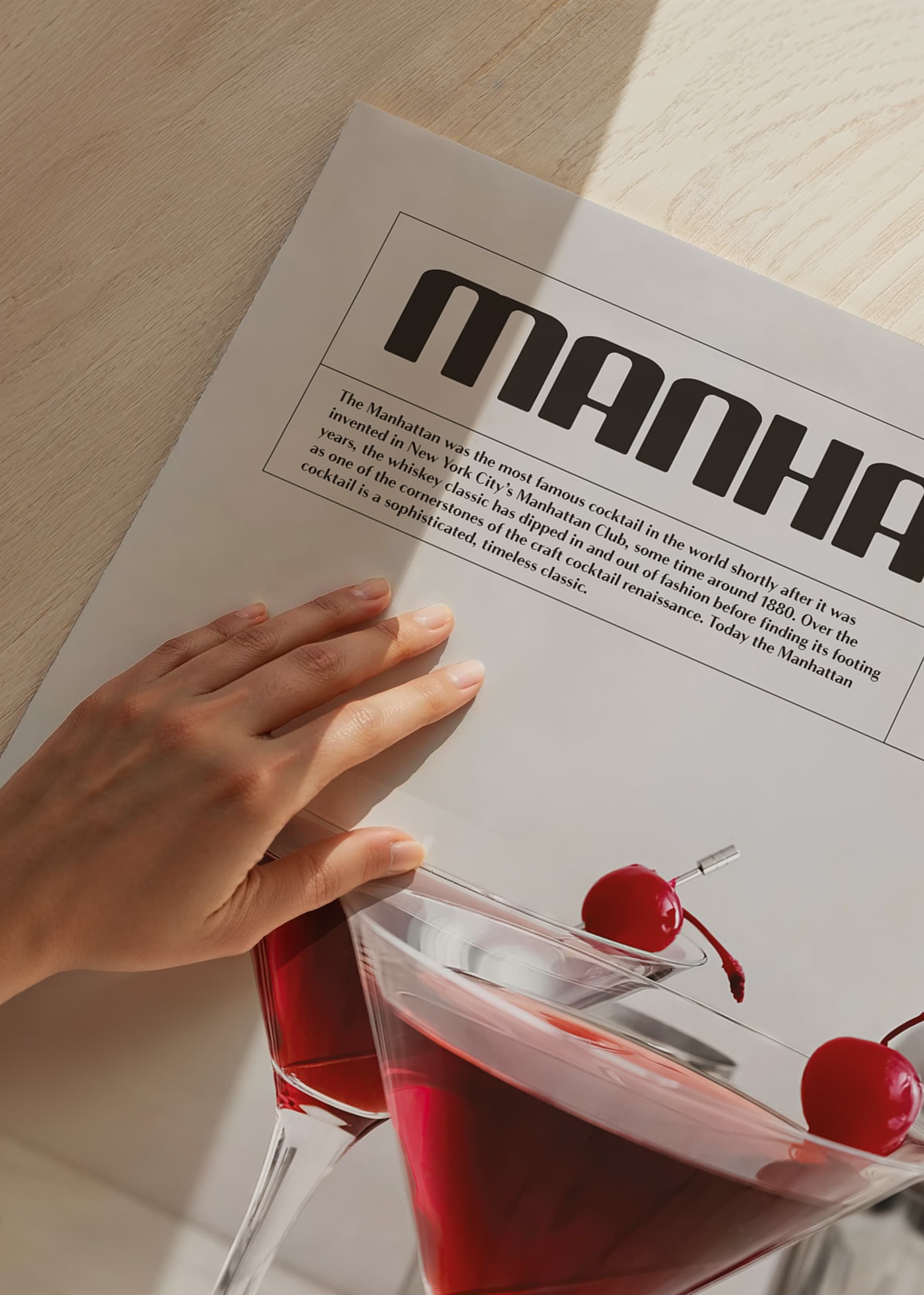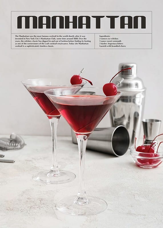 Duas taças de coquetel Manhattan, com tom marrom-avermelhado e cerejas vermelhas, destacam-se sobre um fundo claro. Ao fundo, uma coqueteleira, um coador e pequenas tigelas são visíveis, criando um autêntico ambiente de bar. A receita e um breve histórico da bebida estão impressos no pôster, conferindo à cozinha um toque elegante e sofisticado.