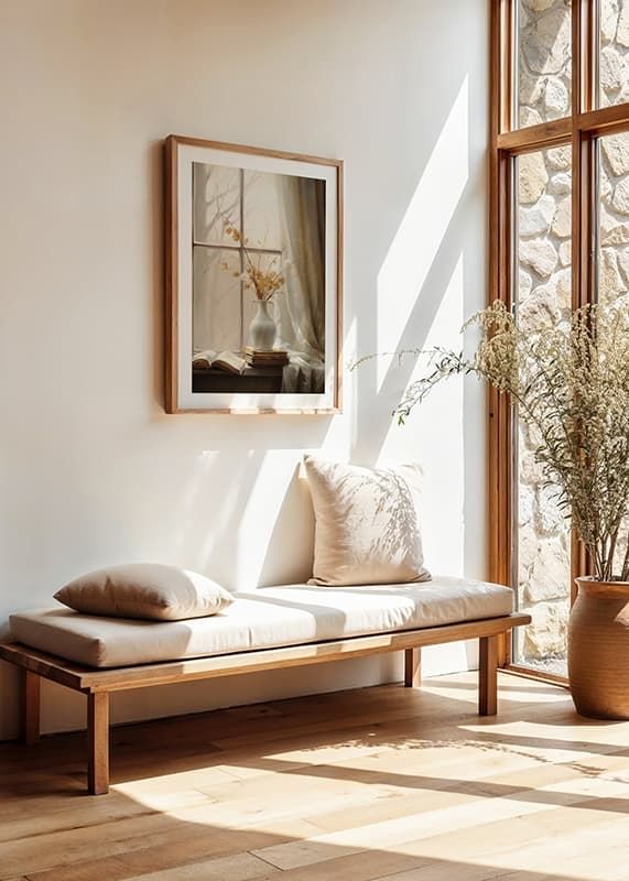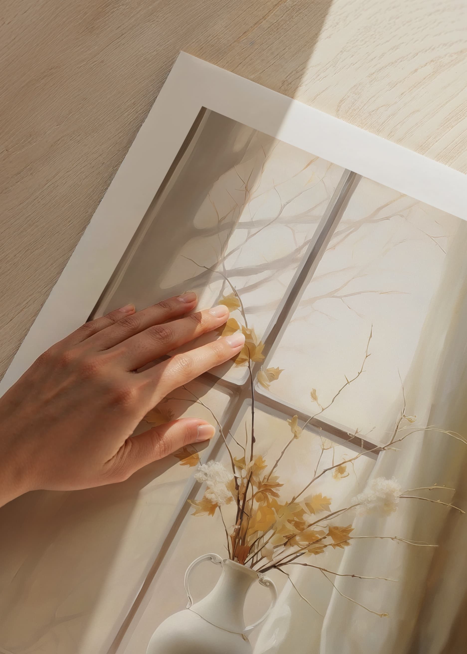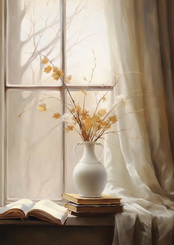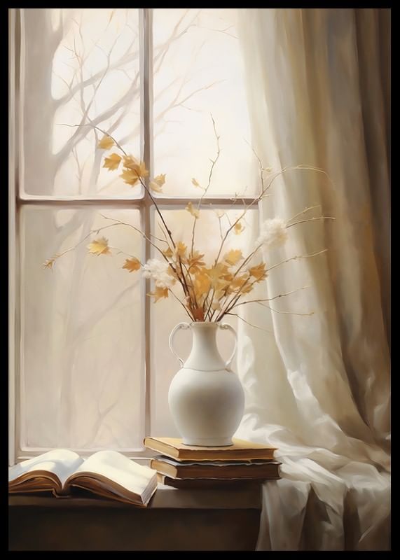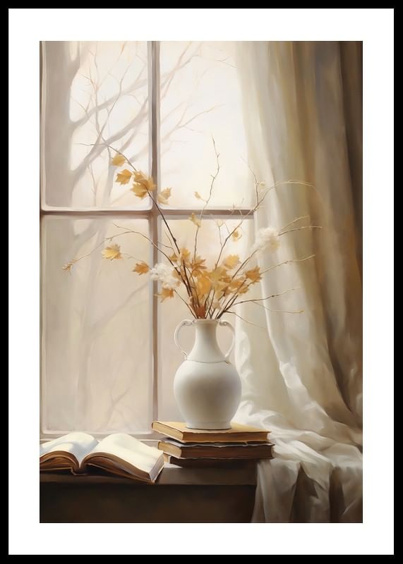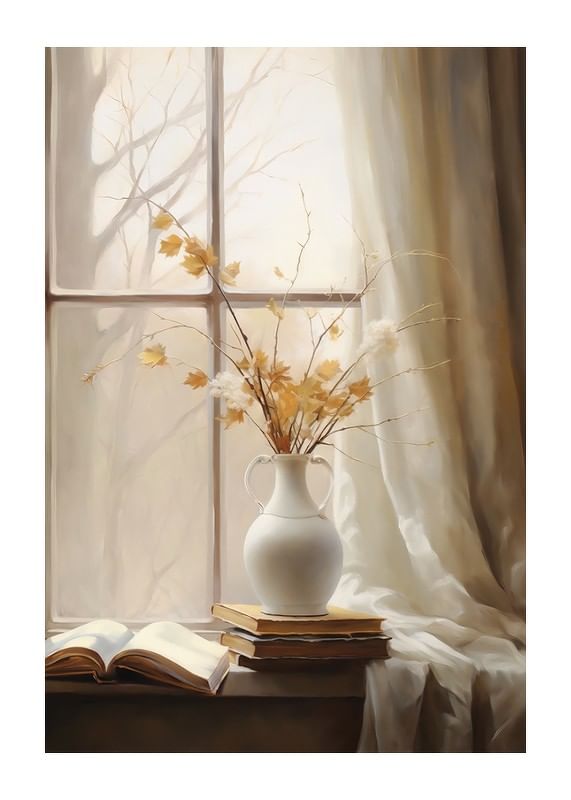 Galhos com folhas amarelas de outono e flores brancas repousam em um vaso de cerâmica branca no parapeito de uma janela. A janela é cercada por cortinas leves; do lado de fora, as silhuetas das árvores podem ser vistas na penumbra. Há também alguns livros no parapeito da janela, um dos quais está aberto. Este pôster traz um toque de calma e aconchego à casa.