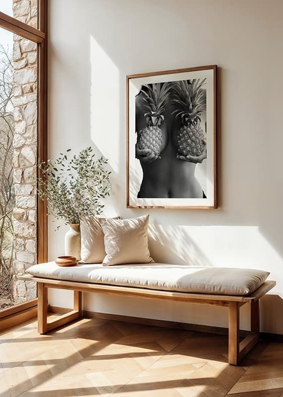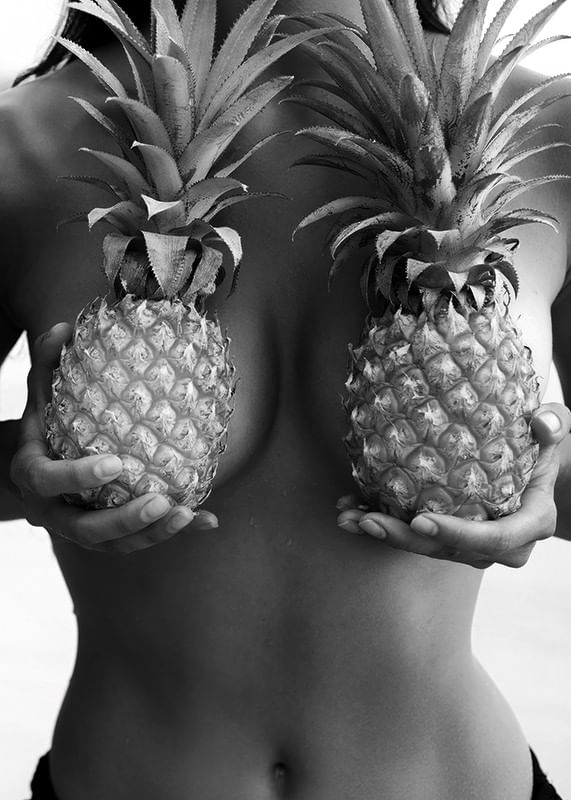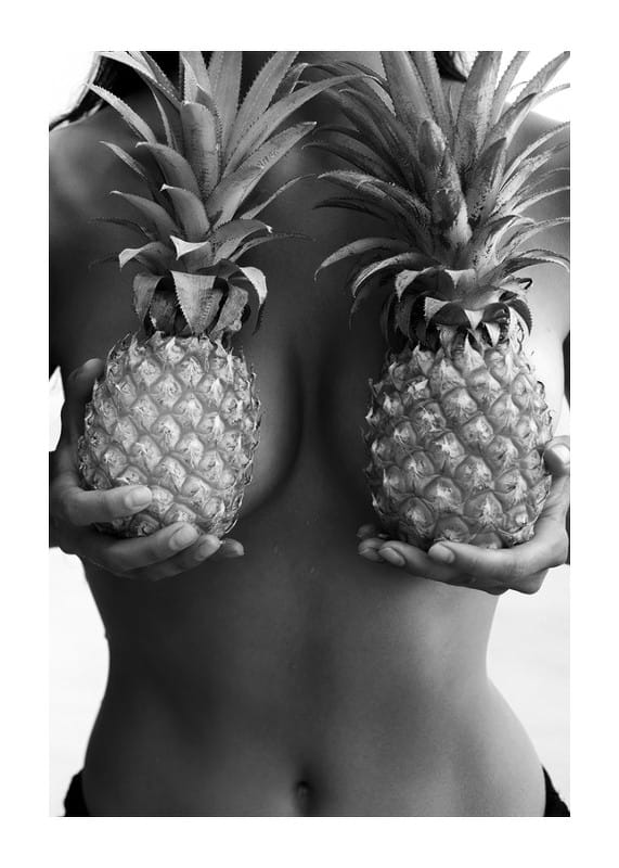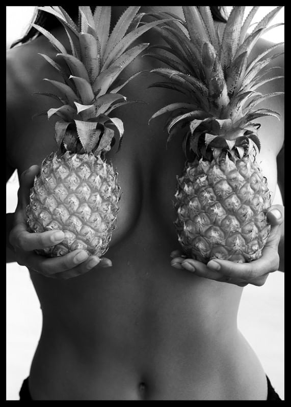 Dois abacaxis são segurados nas mãos em frente ao torso nu de uma mulher neste pôster em preto e branco. Os fortes contrastes e a temática fashion do motivo criam uma impressão expressiva e lúdica. Ideal para chamar a atenção em ambientes modernos, onde pôsteres com personalidade e estilo adicionam uma sensação inspiradora ao ambiente.