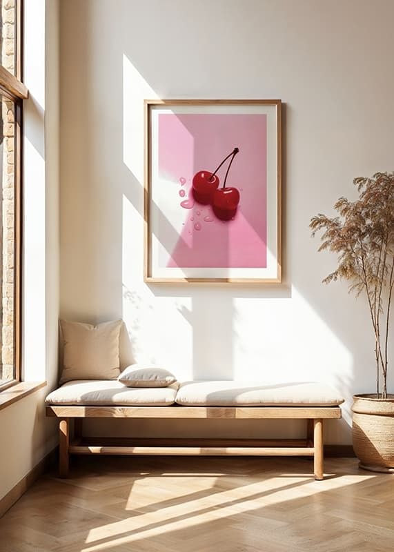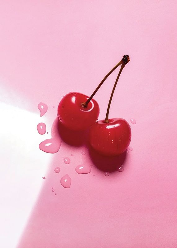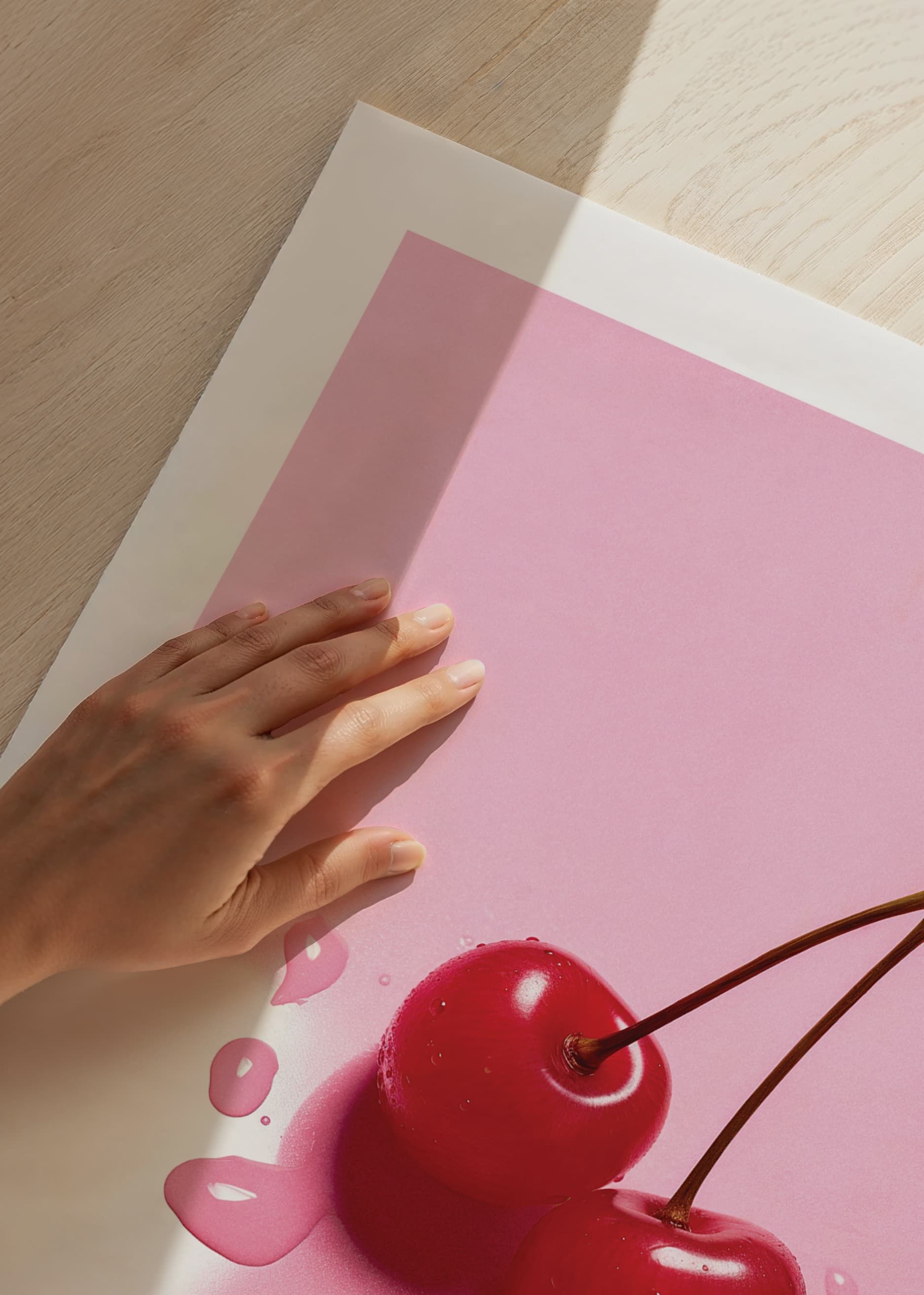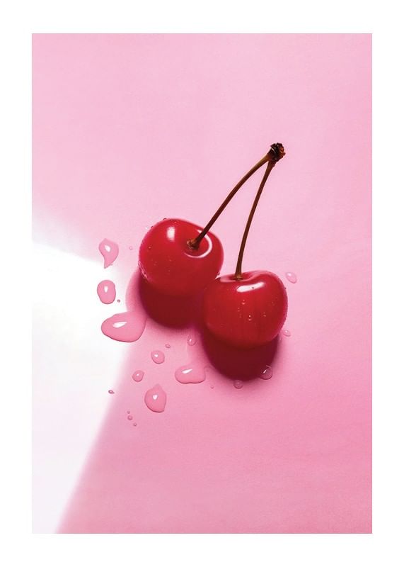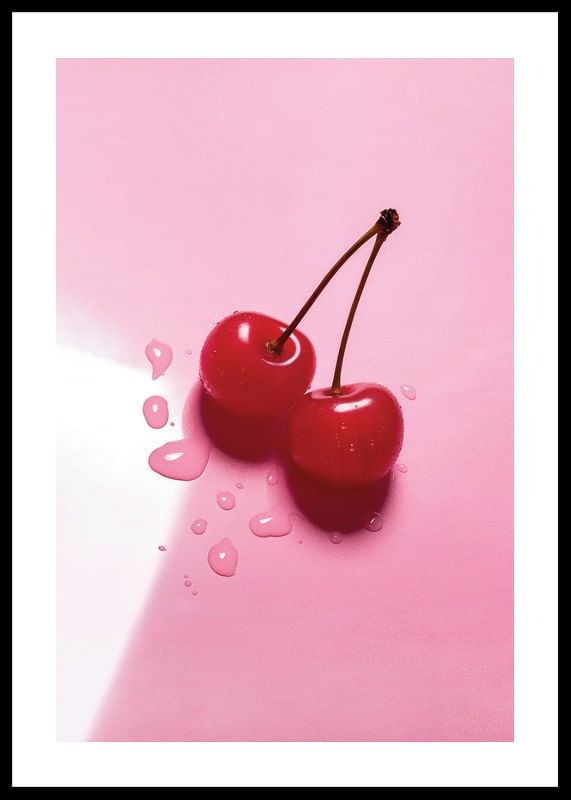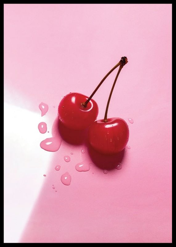 Duas frutas vermelhas brilhantes, com caules longos, dispostas lado a lado sobre um fundo rosa brilhante. Algumas gotas de líquido envolvem as frutas e conferem um toque de frescor ao motivo. Este pôster adiciona um toque colorido e moderno à cozinha ou ao bar da casa, além de ser uma ótima decoração para áreas sociais.