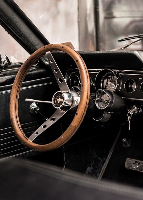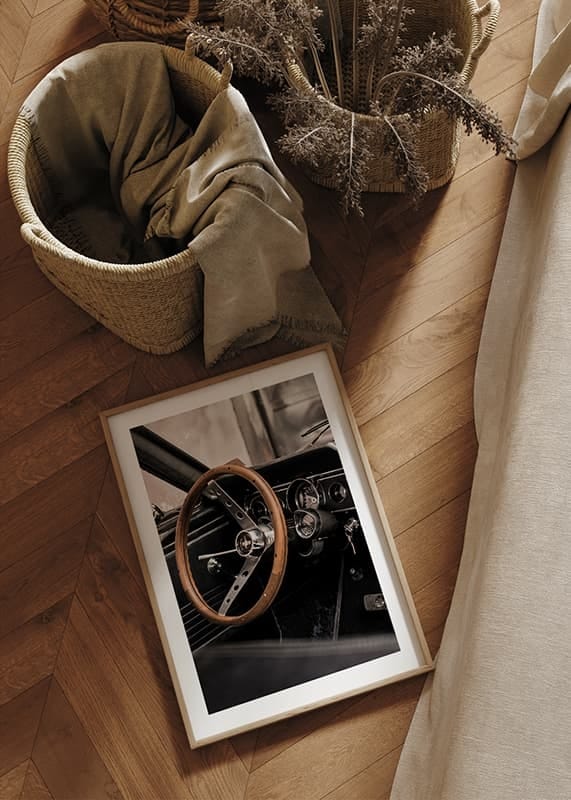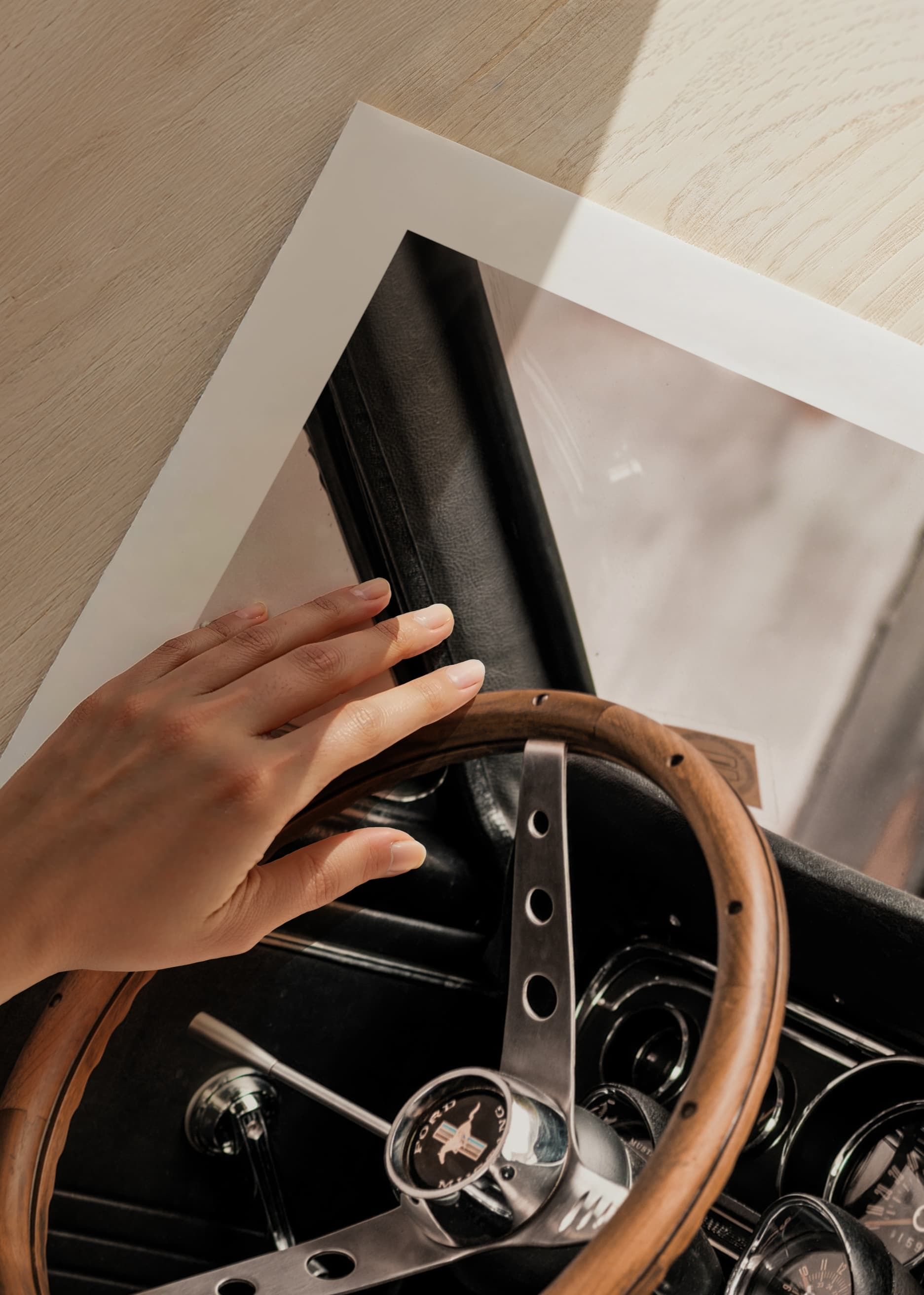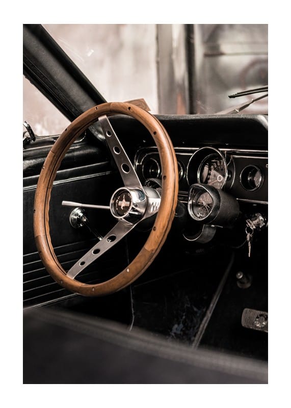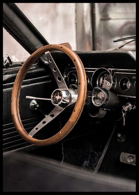 Close-up do interior de um carro clássico, com um volante de madeira em destaque, cercado por detalhes cromados e painéis pretos. Tons suaves de bege e preto conferem um toque atemporal. Este item combina com a garagem, o escritório ou a sala de estar, onde o interesse pelo vintage e pela história do automóvel é realçado.