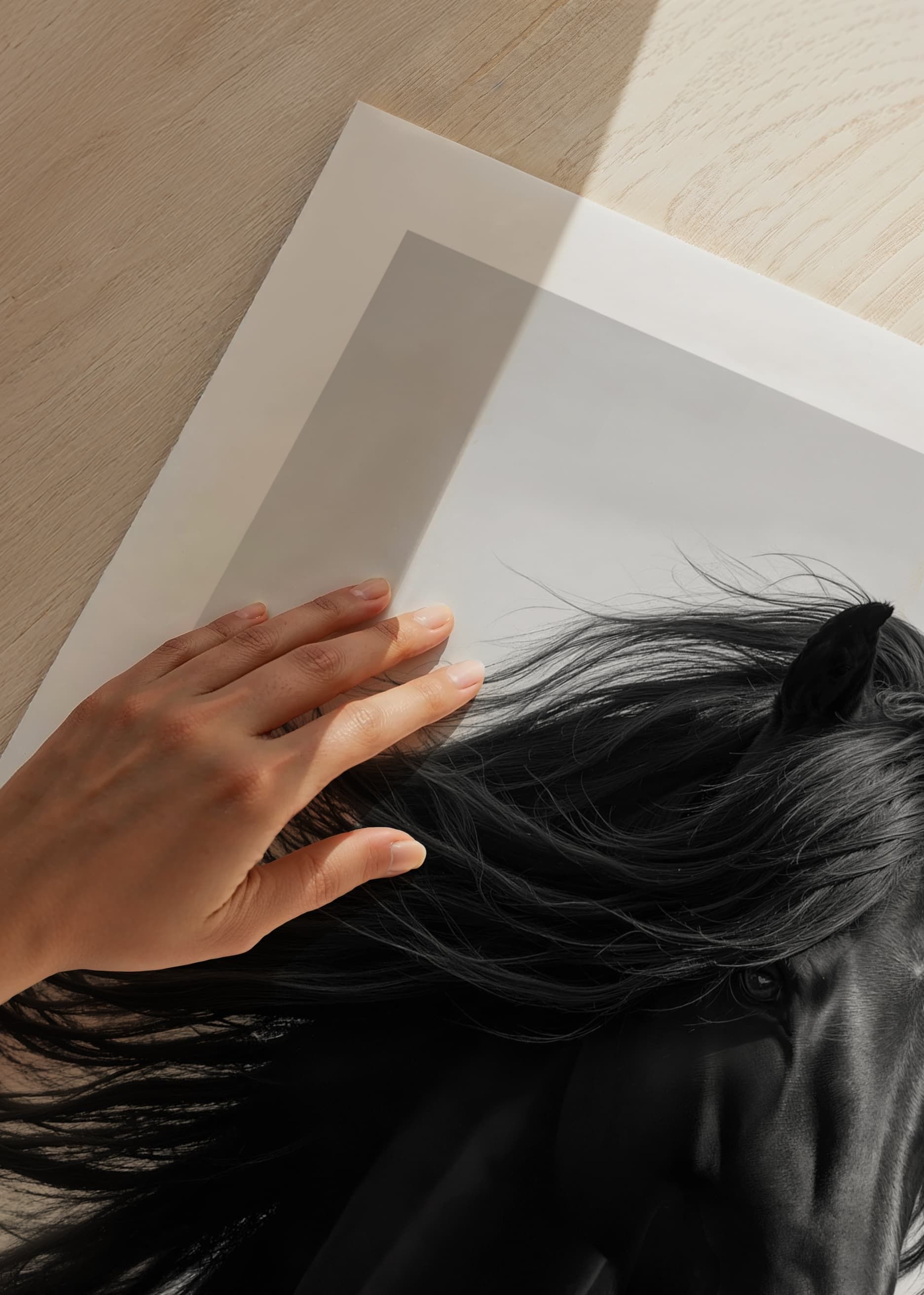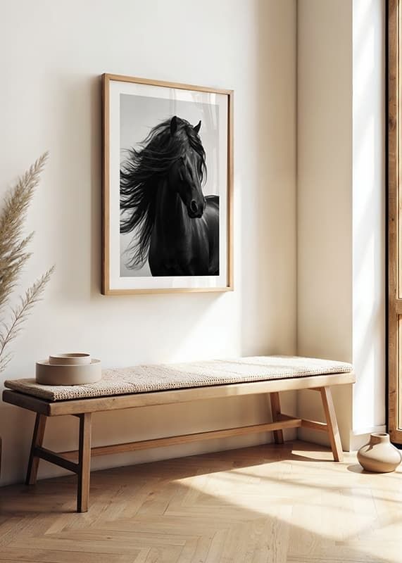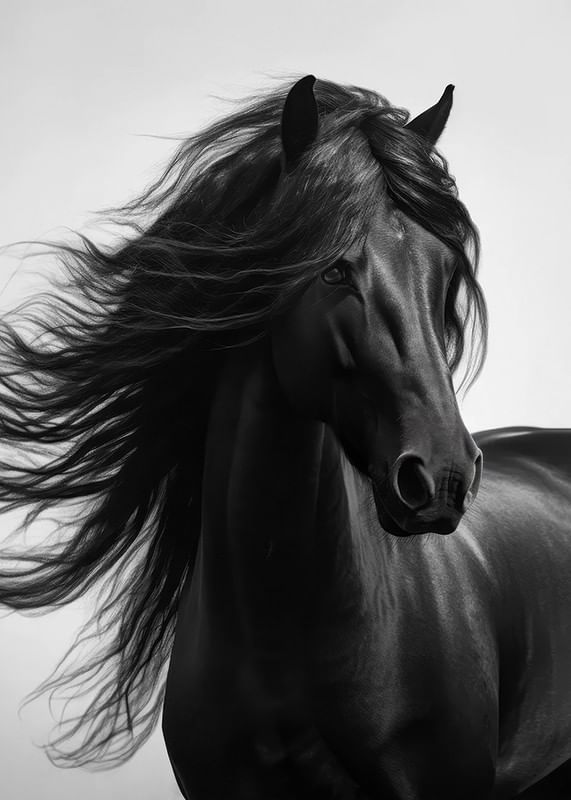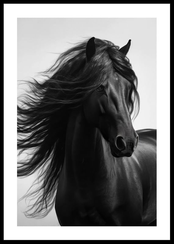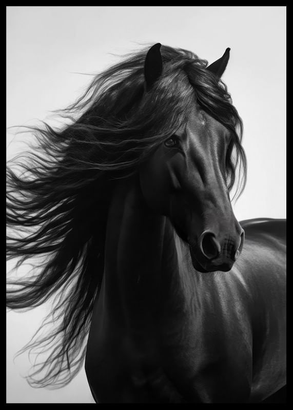 Close-up de um cavalo preto com crina abundante estendida para o lado, sobre um fundo claro e neutro. Os contrastes marcantes entre a pelagem brilhante do cavalo e a luz suave criam uma expressão elegante e atemporal. A sensação poderosa do motivo torna este pôster um complemento elegante para qualquer sala de estar, quarto ou escritório.