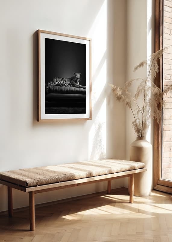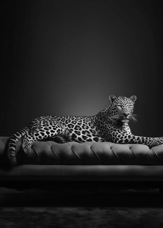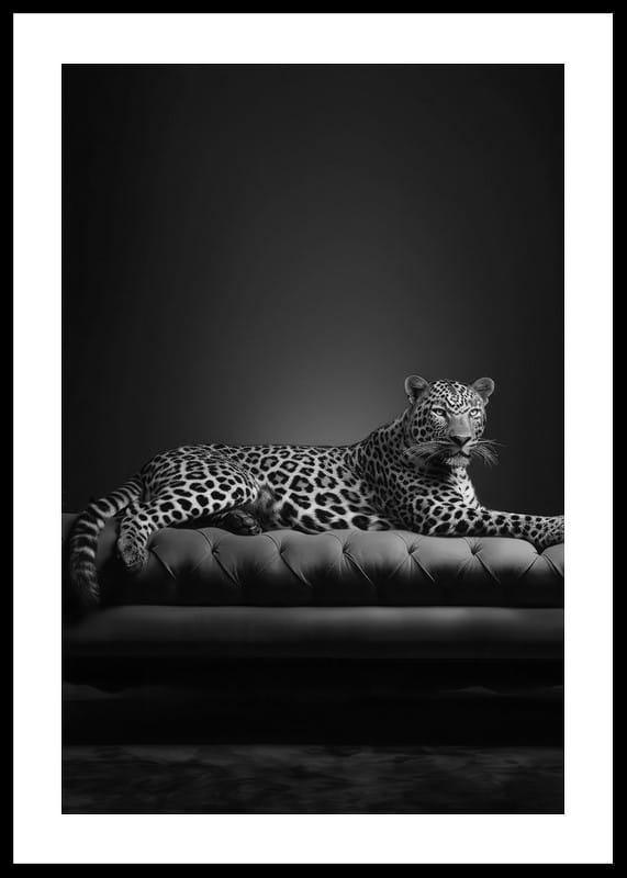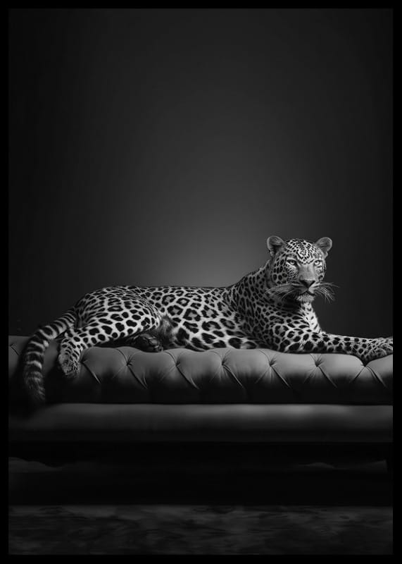 Um leopardo repousa estirado em um sofá elegante sobre um fundo escuro. A imagem é em preto e branco, com contrastes nítidos e foco no padrão e na presença únicos do animal. A composição elegante confere um toque moderno e ousado. Este pôster combina tanto com salas de estar quanto com casas contemporâneas, onde a arte fotográfica expressiva é apreciada.