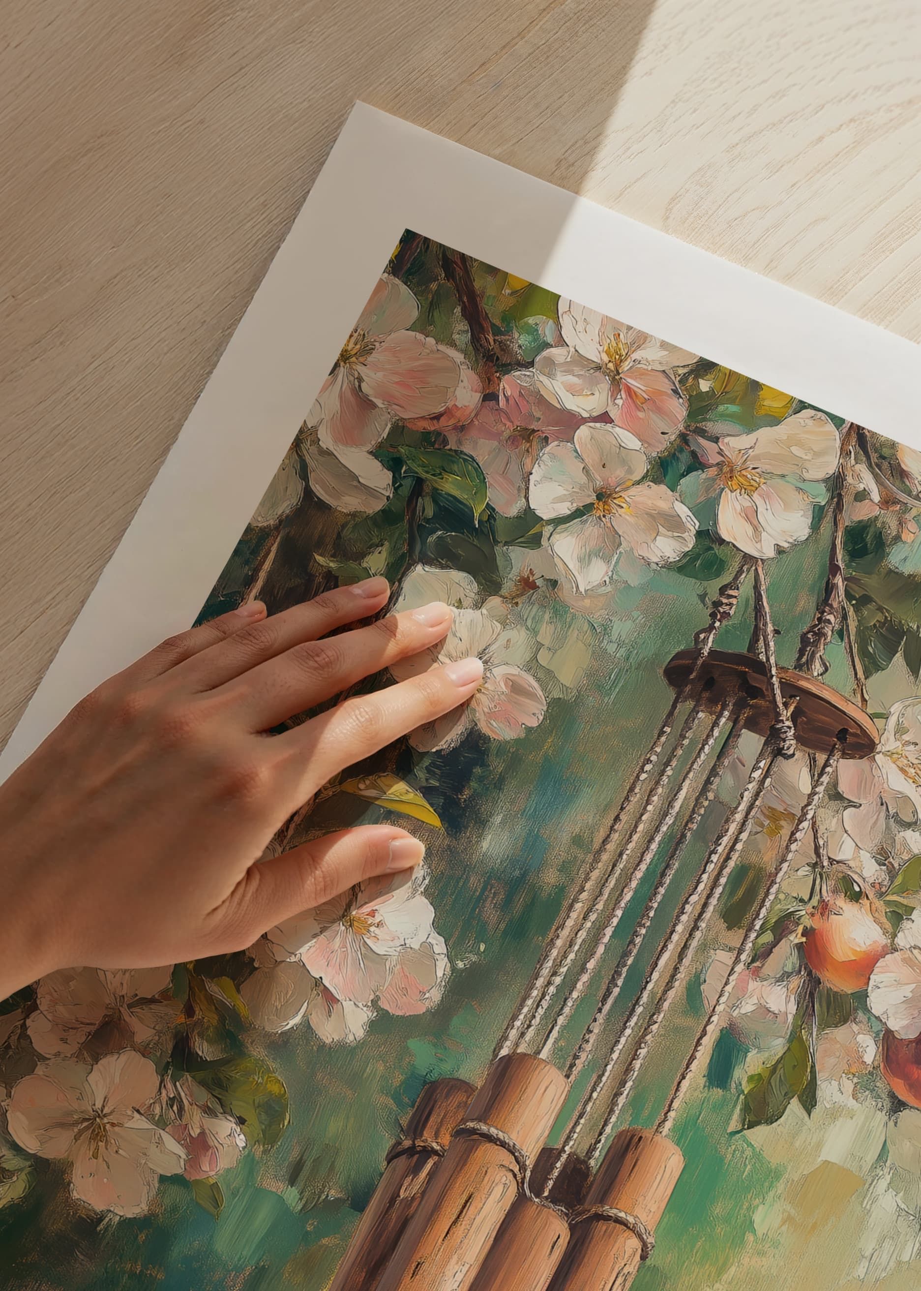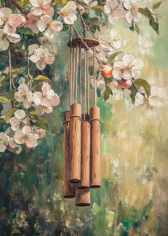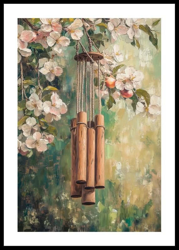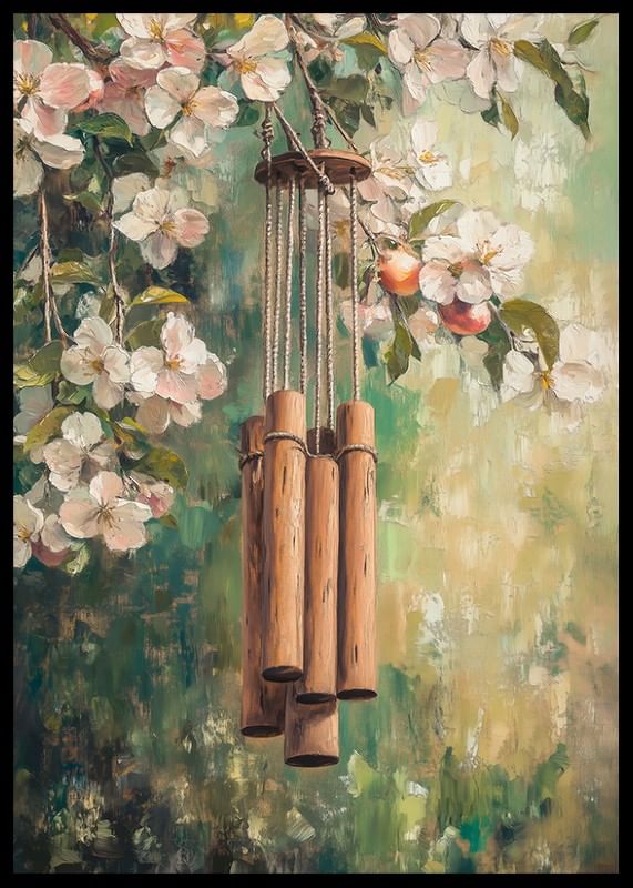 Sinos de vento de madeira pendem entre galhos cobertos de flores brancas e rosa-claro, sobre um fundo em tons de verde e amarelado. As pinceladas suaves e as cores naturais conferem ao motivo uma sensação de frescor verde. Este pôster é adequado para ambientes onde a presença da natureza traz paz extra.