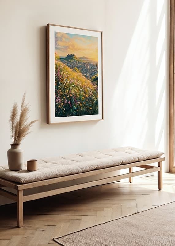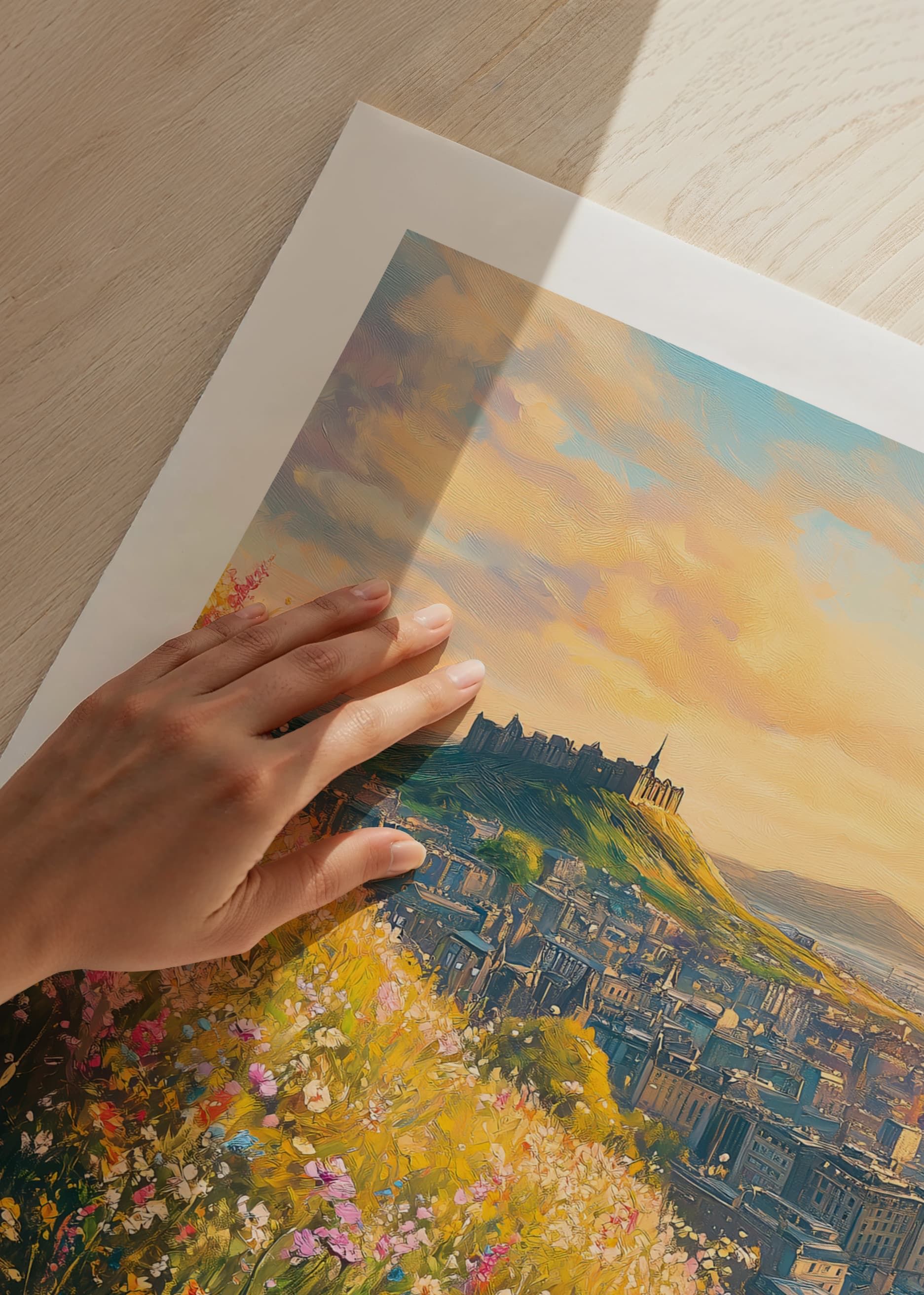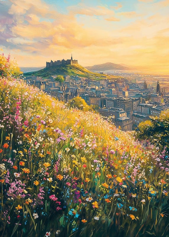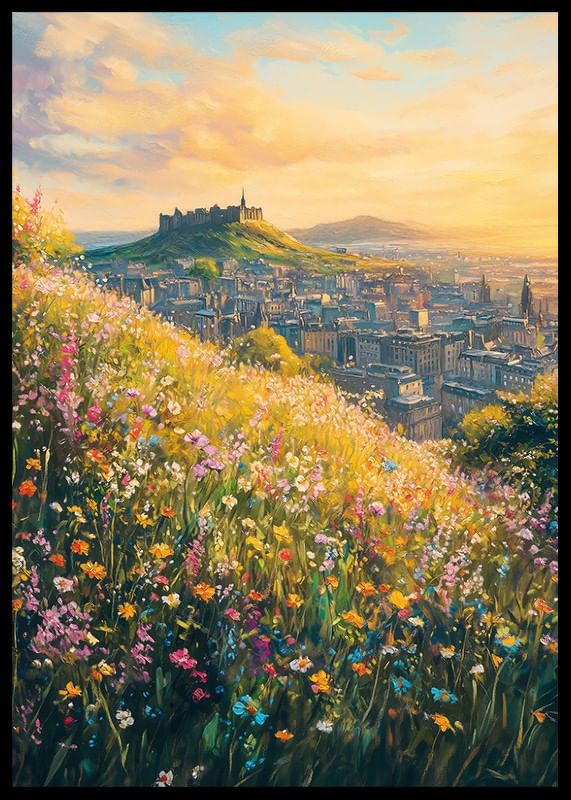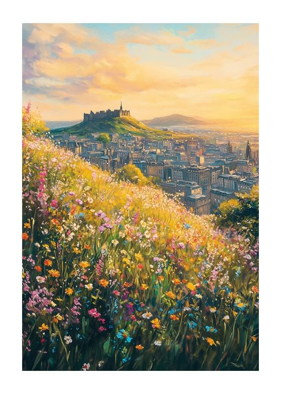 Flores coloridas do campo se espalham em primeiro plano, atraindo o olhar para o horizonte de Edimburgo e o famoso castelo na colina, emoldurados pela cálida luz dourada do entardecer. Com pinceladas suaves, a transição entre a natureza e a cidade é capturada neste pôster, que confere ao ambiente uma sensação de amplitude e luz.