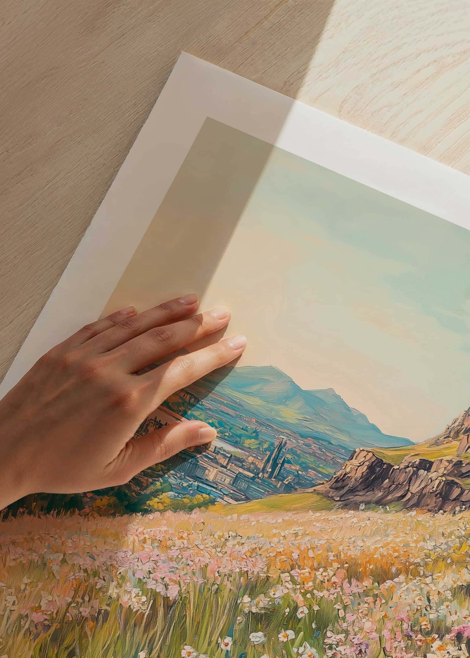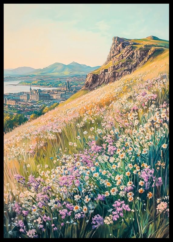 Flores silvestres coloridas se espalham por uma encosta ensolarada, atraindo o olhar para uma cidade com prédios e torres distintos ao longe, emoldurada por montanhas ondulantes e tons pastéis suaves no céu. Este pôster une as flores da natureza e a arquitetura urbana de uma forma que dá vida a casas modernas e clássicas.
