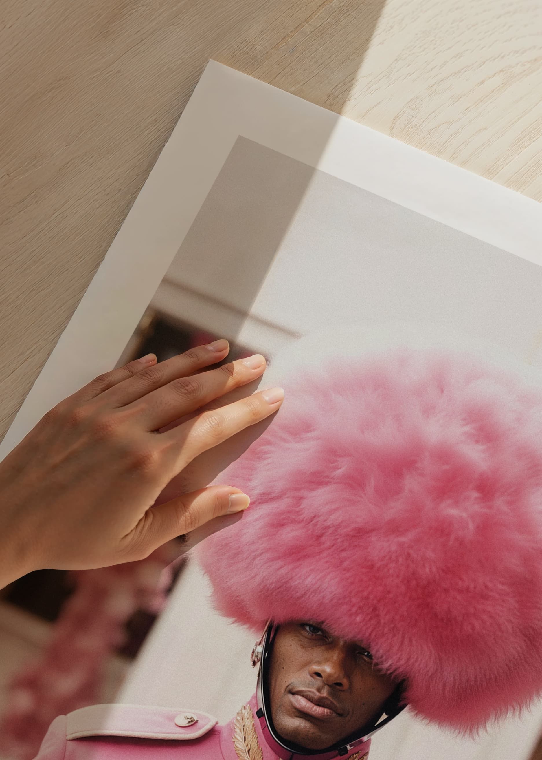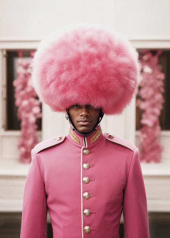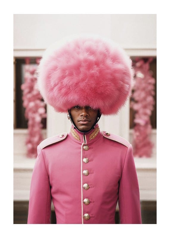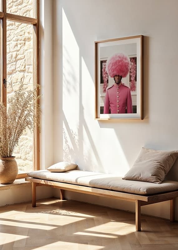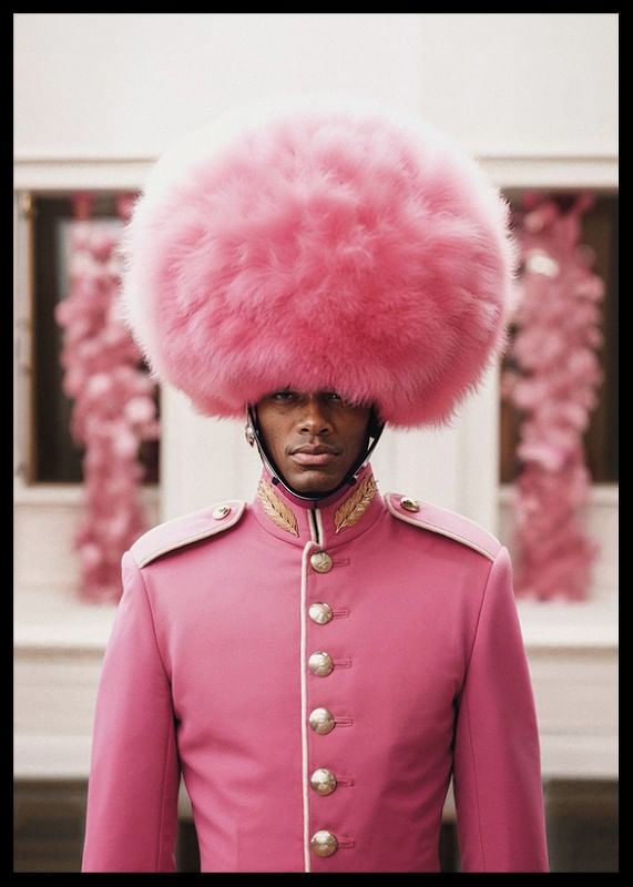 A vista frontal mostra um guarda real trajando um uniforme todo rosa com botões dourados e detalhes decorativos. A grande pena rosa cria um contraste marcante contra um fundo claro e desfocado. Este pôster transmite uma sensação moderna e lúdica, sendo particularmente adequado para salas de estar ou corredores, proporcionando uma expressão elegante.
