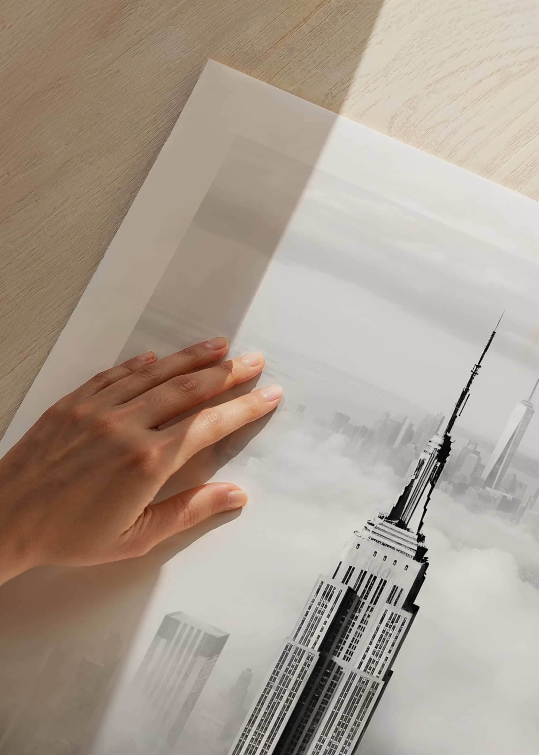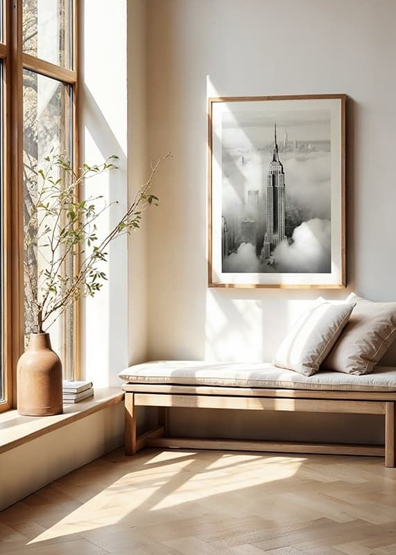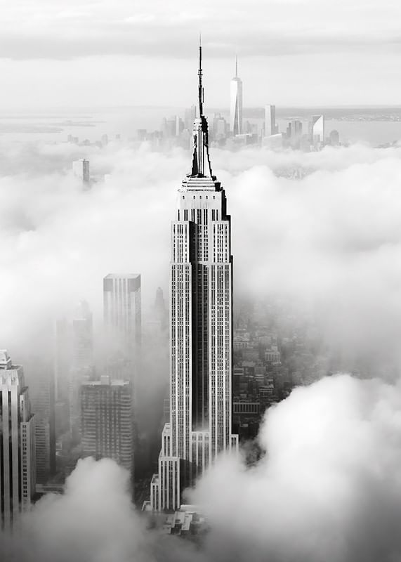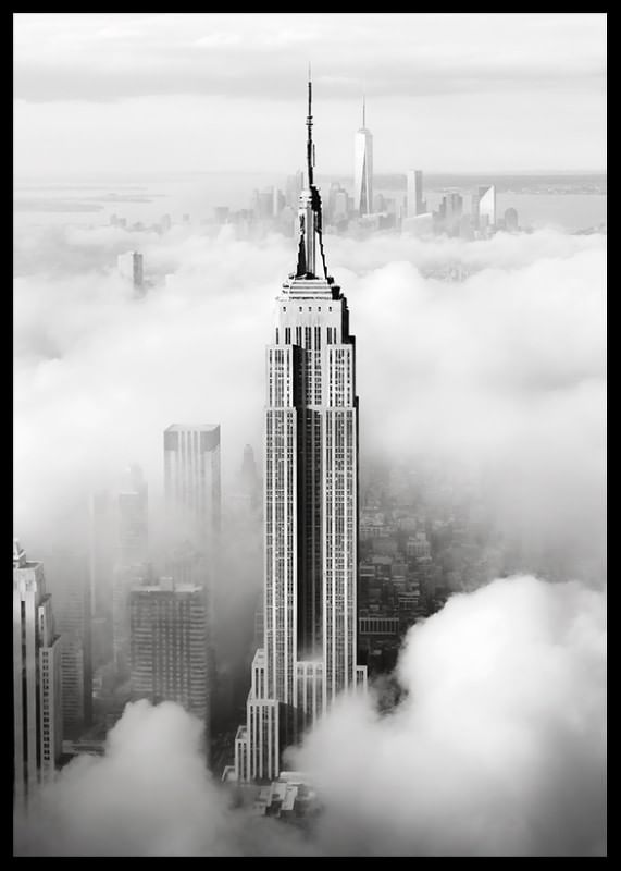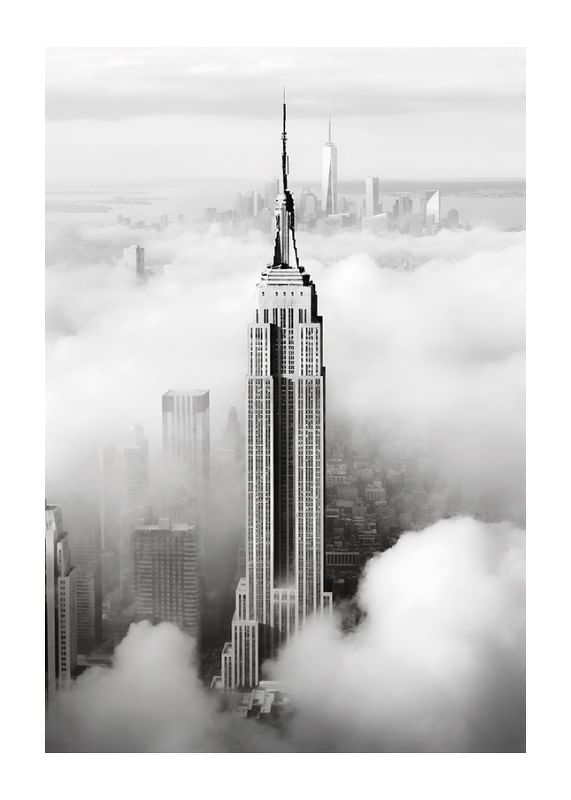 O Empire State Building ergue-se entre nuvens baixas, com o horizonte de Manhattan vagamente visível ao fundo. O contraste entre linhas nítidas e nuvens suaves cria uma sensação gráfica e moderna em preto e branco. Este pôster confere uma expressão elegante e urbana a, por exemplo, uma sala de estar ou um escritório.