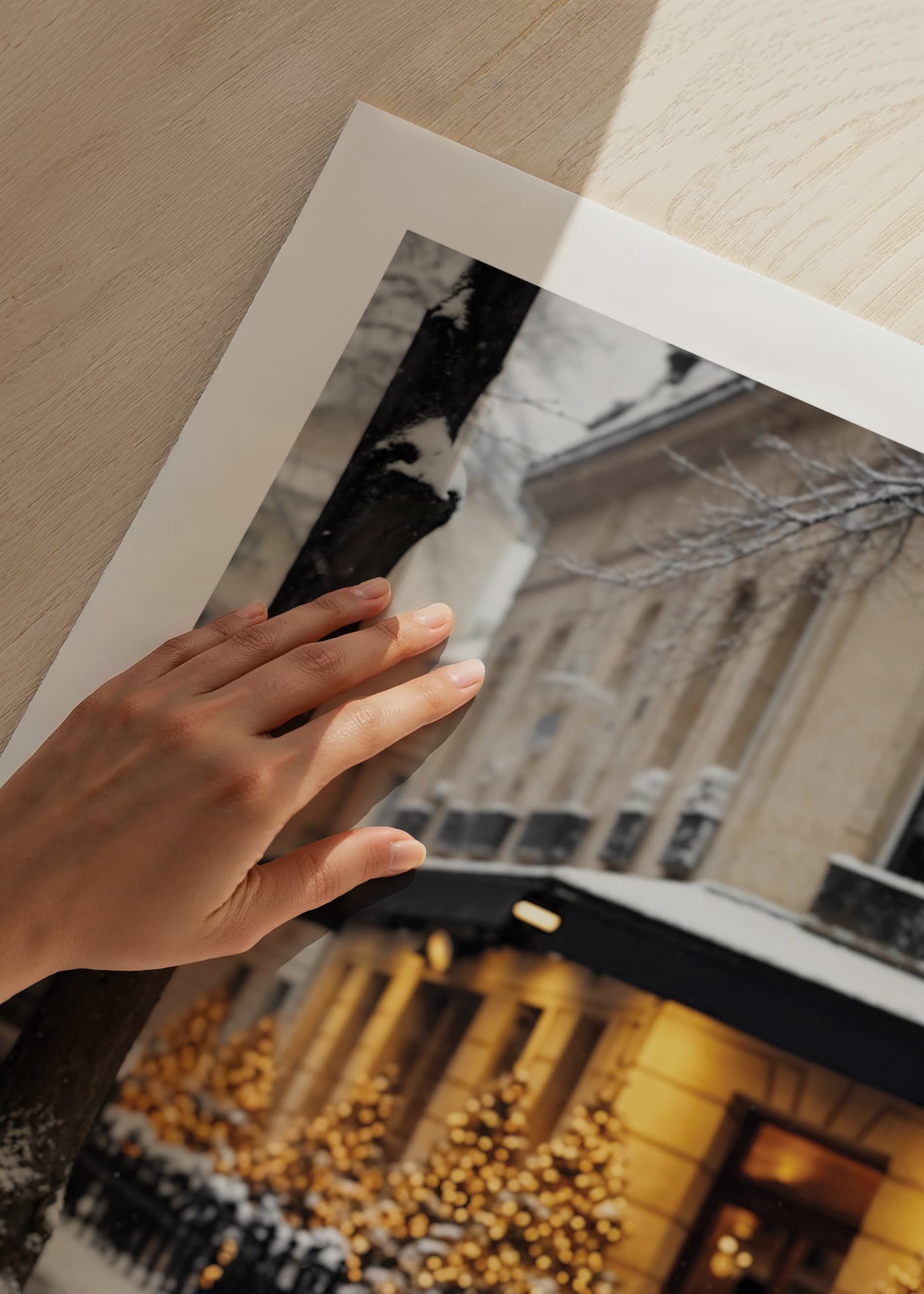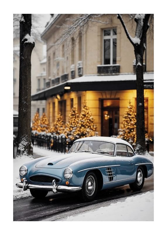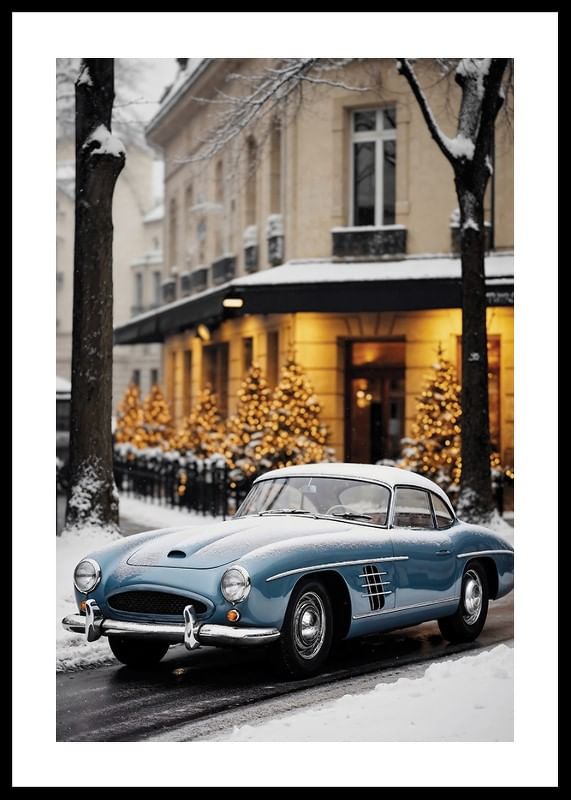 Um carro vintage azul está estacionado em uma rua coberta de neve, em frente a um edifício elegante, emoldurado por árvores de Natal brilhantes e luzes aconchegantes. O cenário invernal e as linhas suaves do veículo clássico criam uma atmosfera atemporal. Este pôster adiciona uma combinação de nostalgia e charme urbano a ambientes como a sala de estar ou o corredor.