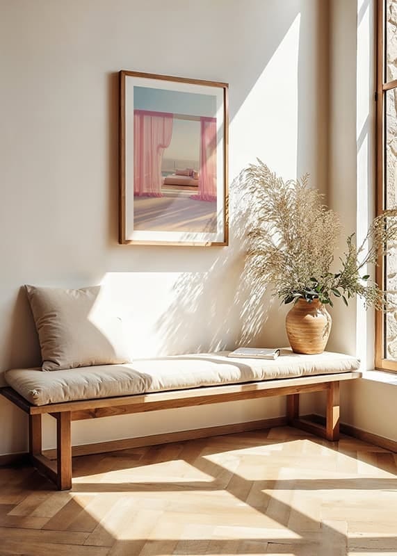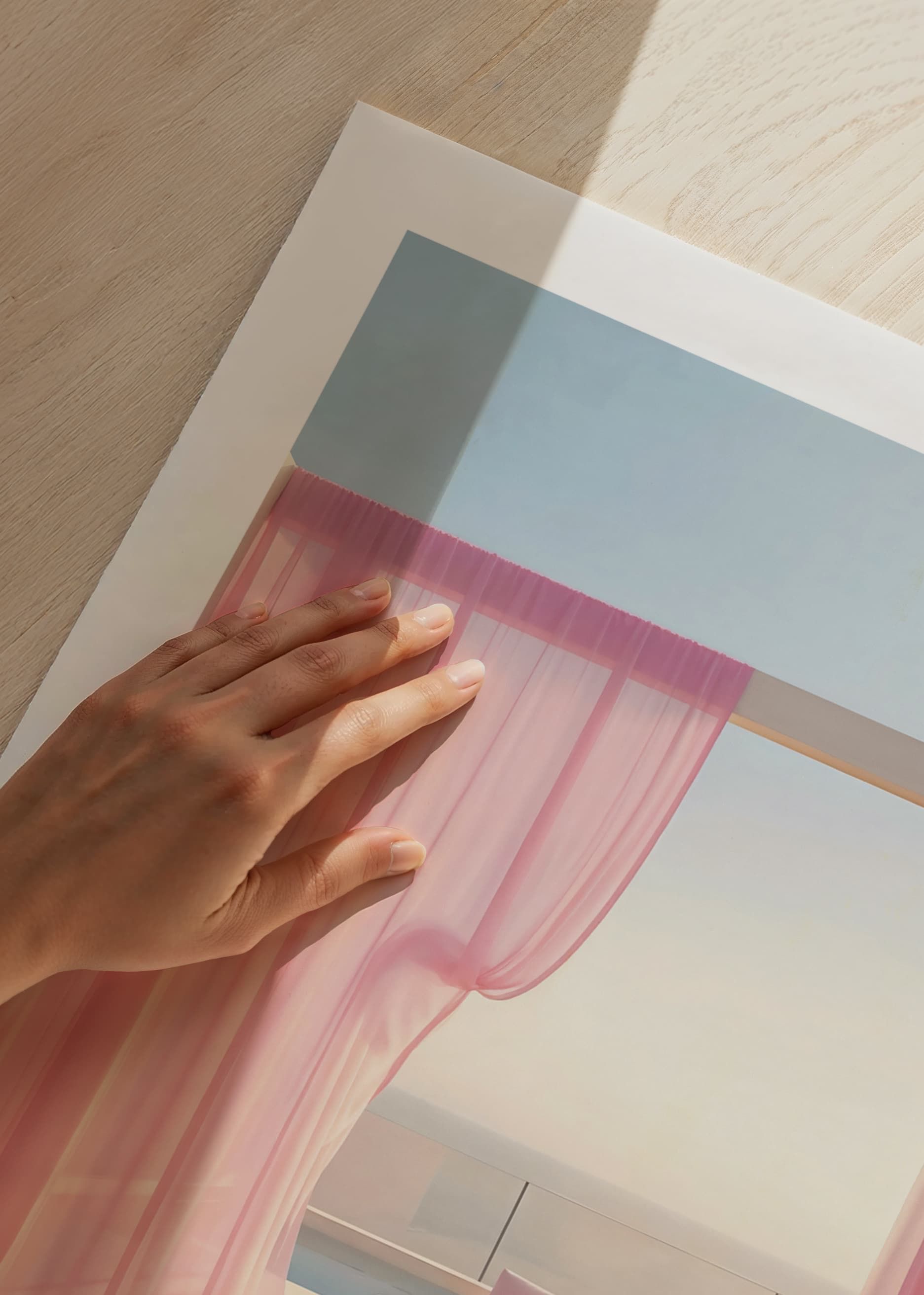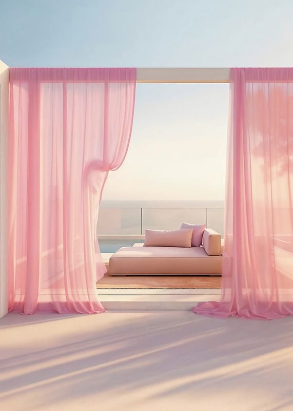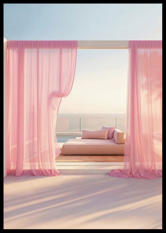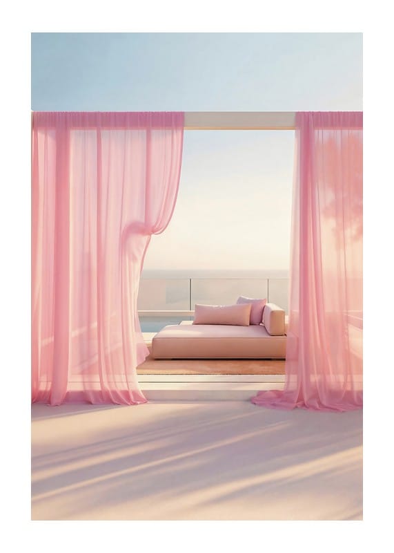 O tema consiste em um sofá-cama iluminado colocado em um terraço, cercado por cortinas rosa esvoaçantes que deixam entrar a suave luz do dia. Ao fundo, avista-se o mar e um céu azul claro, conferindo a este pôster uma atmosfera relaxante e de verão. Adequado para quartos ou salas de estar que desejam um ambiente arejado.