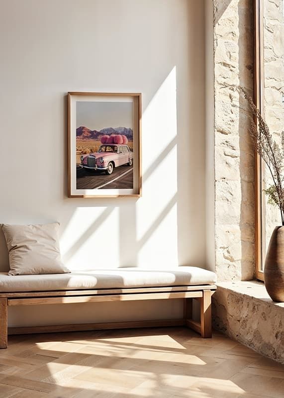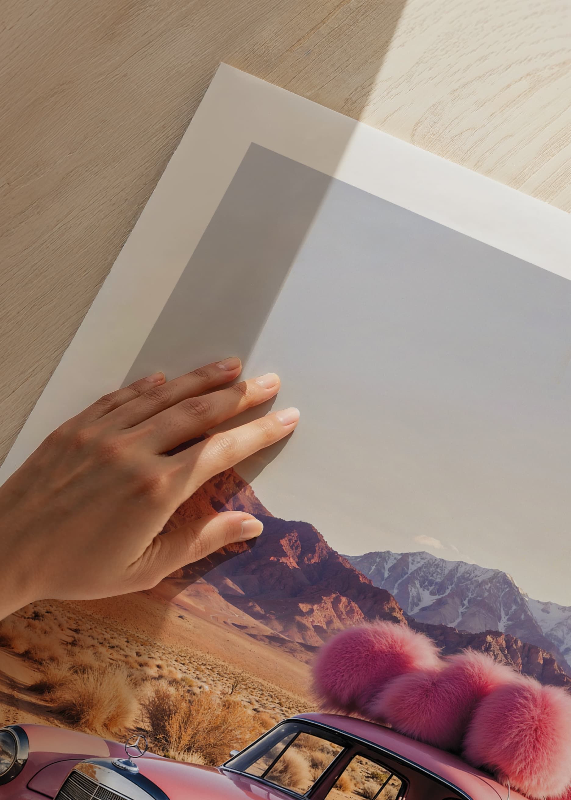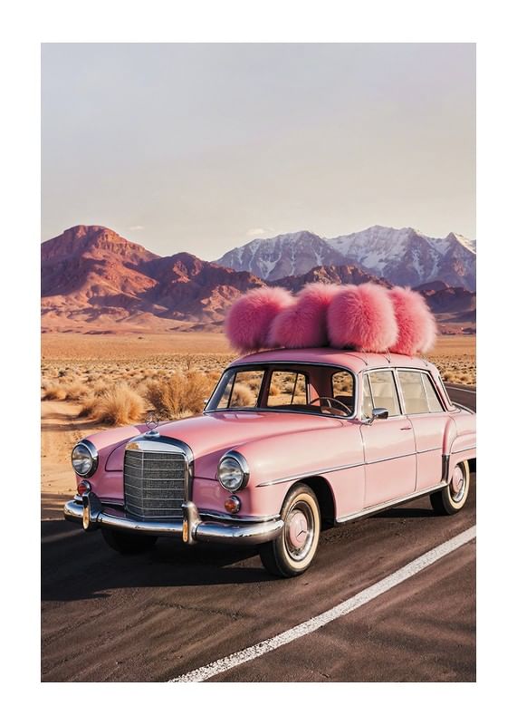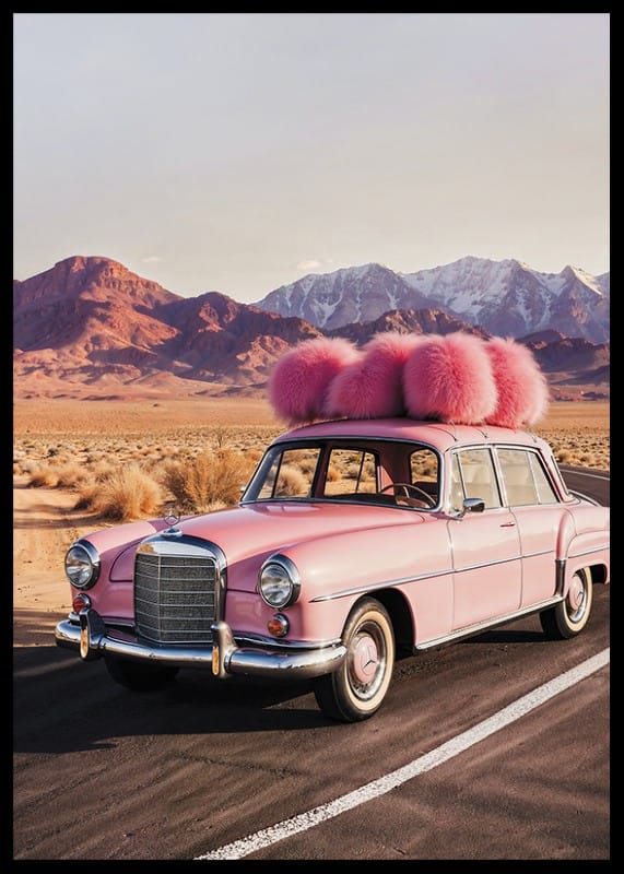 Um clássico Mercedes rosa pastel está estacionado em uma estrada que atravessa uma vasta paisagem desértica, com montanhas impressionantes ao fundo. O teto do carro é decorado com grandes plumas rosa fofas que conferem ao tema uma expressão lúdica. Este pôster adiciona cor e estilo retrô a casas modernas ou ambientes criativos.